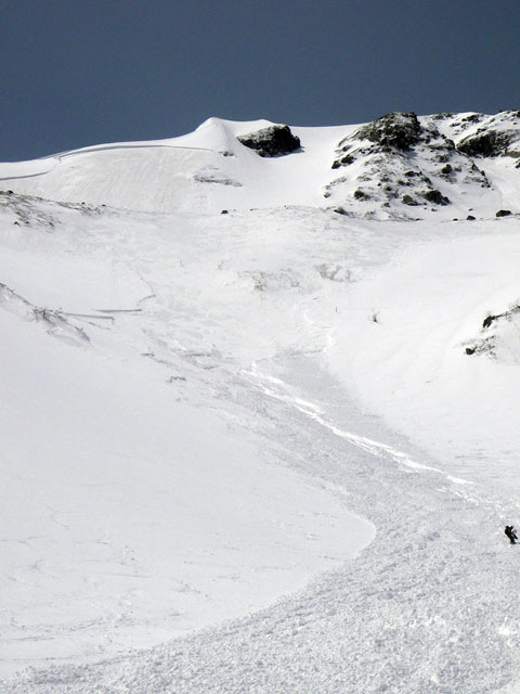 テラスまであと20メートルくらいのところまできたところで、Bが突然こっちにむかって叫びだす。最初は能天気に「ガンバレ〜!」といってるのかと思ったが、どうも叫ぶ感じが違う。で、後ろ振り返ると30メートルくらい後ろ上方のテラスから猛烈な勢いで雪が噴出している!!とにかく巻きこまれないように猛烈にダッシュし、改めて振り向くと雪崩はまだ続いており、なんと一緒に人が猛烈な勢いで転がっている。後にいるBがいることも確認でき、出合い付近にいるパーティーが気づいているかわからないのでとにかく、大きな声で「雪崩!逃げろ!」と叫ぶ。