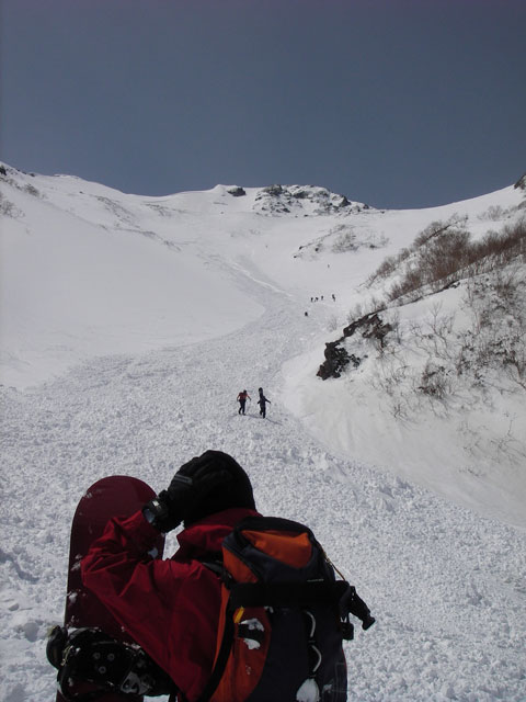 休憩後、再び上り返したが、私のカカトの皮が向けてしまってきたため、マヤクボ沢の出合いすぐであらためて、荷物を降ろし足に絆創膏を貼る。このとき、ここがその20分後くらいに雪崩の走路となるとは思いもしなかった。そして一度追い抜いたツボ足アイゼンで登る単独のボーダーに追い抜かれる。下部と違い、積雪も増えてきているためかなり苦戦して歩いているようだ。上部には10名以上の人がすでにマヤクボ沢の途中まで登っているのが見える。