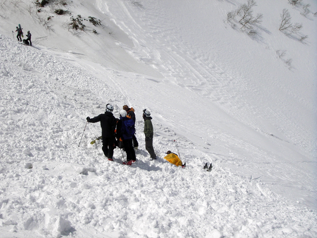 夕方のニュースで幅30メートル長さ200メートルの雪崩があったと報道され、翌日の新聞にもそのようにでたようですが、実際は標高差500メートル以上、長さ1000メートル以上あった非常に大規模なものでした。発生原因も人為的であれば、その後の入山者の行動も大変危険なことがおおく、現在のBCブームについて深く考えさせられます。