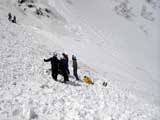 端によってとにかくシールをはずすことにするが自分たちの場所もテラスから上が見えず恐ろしいばかりで、手が震えてなかなかうまく作業がすすまない。そんななか速攻でシールをはずしたBが、私より100メートル位下のところで巻き込まれた雪崩から抜け出せた人のところへいき、他にメンバーがいないかを確認、一人いることがわかりただちに捜索に入り、デブリのなかをビーコンで探知しながら下っていった。