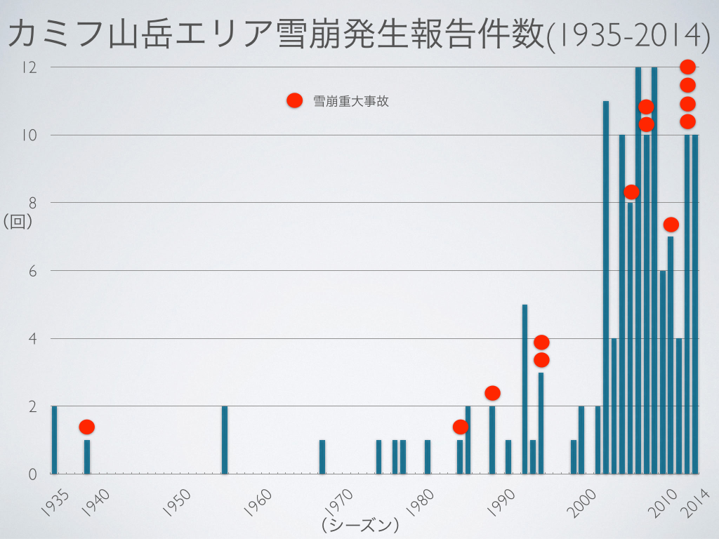 こちらのグラフは、十勝岳エリアでの雪崩報告件数の推移を示したものです。 横軸はシーズン、縦軸は雪崩の発生報告件数です。 赤丸は、重大事故(死亡・重傷事故)を示します。 このグラフから、ほとんど雪崩が報告されていない1937-1974シーズン、低いながらも一定の頻度で雪崩が報告されるようになった1975〜2002シーズン、急激に雪崩報告の頻度が高まった2003シーズンから現在までという傾向が読み取れます。