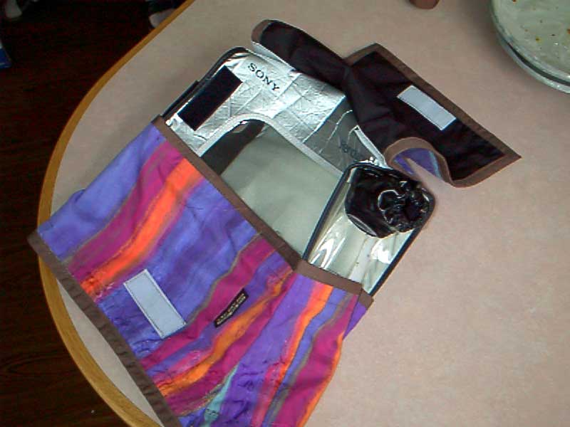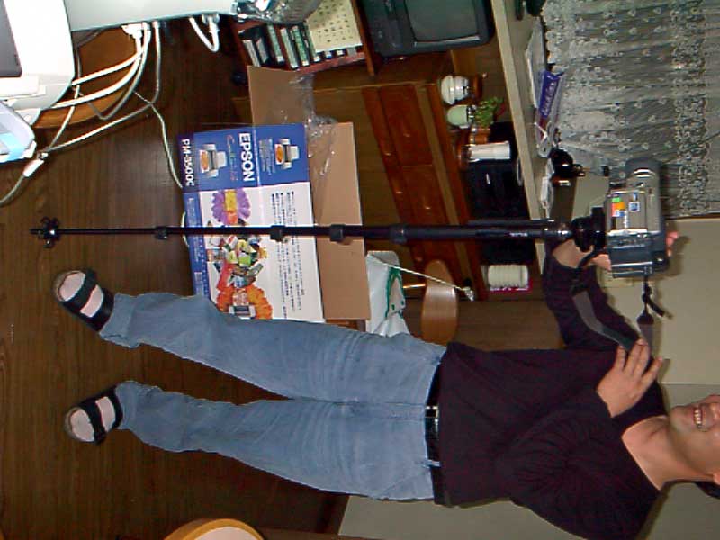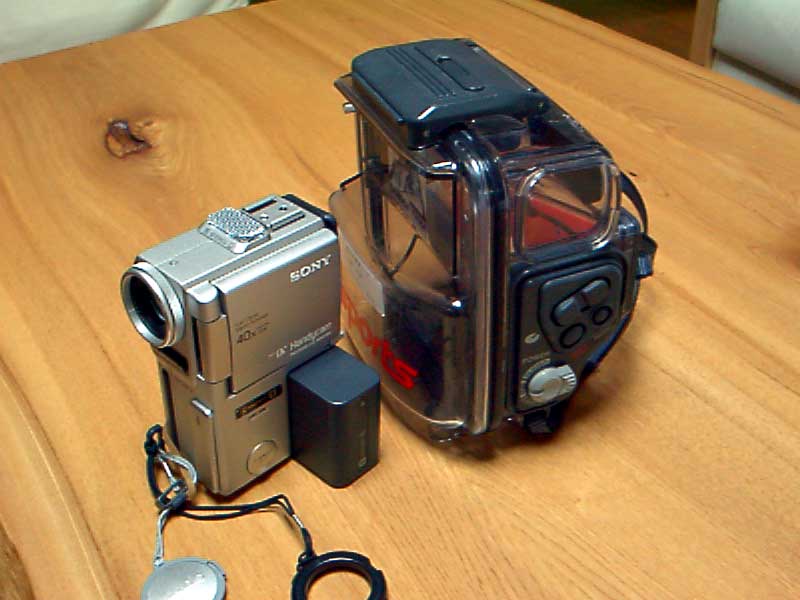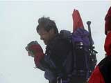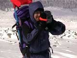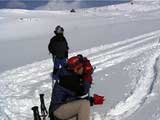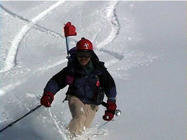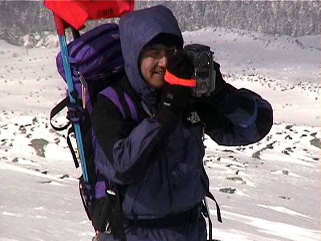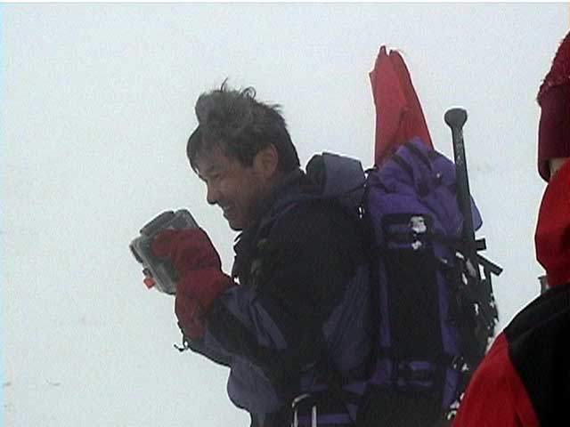 | 私の冬山撮影スタイルは、防水ケースに入れたDVカメラ(写真1)をたすきがけにして携行し、ツアーの最中にちょくちょく同行者を撮影するというものです。撮影のためのツアーではありませんから、撮影に手間はかけられません。 1シーン10秒以上撮るなとか、やたらパンやズームを使うなとか、そーゆー一般的な撮影に関する注意点は飛ばします。 カメラ機材の工夫については、道具箱のDTVを見てください。 ここでは、雪山に特化した撮影時のコツを詳しく伝授いたします。 (写真1)●撮る前から勝負は始まっている! 撮影前にいくつか点検しておくことがあります。 1.バッテリー: フィールドではバッテリーの交換なんてできませんので、もちろん前日に満充電です。バッテリー自体の寿命は私の場合で2シーズンでした(意外と短い)。 2.乾燥剤: これは、バッテリーと同じくらい大事です。カメラの防水ケースに入れておく乾燥剤は、いつもチェックしましょう。寿命が切れていると、てきめんにレンズが曇ります。 3.DVテープ: DTVを前提にするならDVテープにタイムコード焼きをやっておきましょう。 これは、少し説明が必要ですね。DVでは、映像と一緒にタイムコードというものを記録しています。 撮影するときに、一瞬でも非録画部を作ってしまうと、そこでタイムコードが「00:00:00.00」に戻ってしまいます。そうなると、タイムコードを利用してビデオをコンピュータに取り込む作業(バッチ処理という)をする際に支障をきたしていまいます。 ですから、撮影前に一旦テープ全域になにかを録画しておくと安心です。 カメラのレンズにカバーをかけたまま録画するか、DVデッキでグレー画面を録画しておくと良いでしょう。また、撮影の際には最初の数秒に捨てカットを入れておかないと、バッチ処理で取り込む際に最初のカットがうまく取り込めない事があります。 ここら辺はDTVならではの面倒な部分ですが、大事なことなのでこまめに実践しましょう。 また、シーズン初めにはビデオカメラのヘッドクリーニングをしておきましょう。 ●レンズが命!拭いて拭いてふきまくれ!! レンズに雪がつく・・・これは冬山撮影時には避けて通れない問題です。 基本的に、ケースを外気温と同じにしておけば、雪は溶けずにレンズの上に乗っているだけの筈です。が、なぜかよくレンズに雪がくっつきます。風が吹けば飛びそうなものなのに、雪が風に乗ってますますレンズにくっつきます。 ですから、レンズは風下へ向けて撮影を行うのが鉄則です。 逆光がどうの、構図がどうの言っていられません。雪が付くとなにも見えなくなるのですから。 レンズを拭うために、カメラ専用のウエスを使ったり、エアで吹き飛ばす道具を試したりしましたが、結局オーバーミトンでレンズを拭うことで落ち着きました。 オーバーミトンに雪が付いていてはだめですので、オーバーミトンの雪を払ってからレンズを拭く・・構えている間にまたレンズに雪が付くのでオーバーミトンの雪を払ってから・・・・ これをひたすら繰り返すのです(写真2)。 (写真2)その間に、息がレンズにかかると大変です。もし息がレンズに届いたら、曇ったり、最悪雪が溶けた後で瞬間的に氷結します。ですからなるべく息を止めながらこの作業を続けます。我慢できなくなると、天を仰いで息を上へ吐き出します。 厳冬期の撮影は、この作業が一番苦しいのです。その点、春スキーは撮影者にとって天国です。レンズに雪が付かないなんて・・・あんなに気楽なものはありません。 ちなみに、ただ構えているだけでもレンズに雪が付くのに、転んだりしたら大変です。 転んで雪まみれになったカメラの雪を除去しているあいだにも、同行者は寒さに震えながら待っているのです。カメラマンは転んではいけません。 どうしても雪が除去しきれないときには、仕方ないのでズームで撮りましょう。焦点距離の関係で雪が目立たなくなります。 ●息を止めて、心臓も止めろ! これって、射撃競技の時によく言われる科白です。照準がブレないようするためですね。さすがに、心臓を止めると死んでしまいますが、息なら10秒くらい止められます。 手持ちのビデオ撮影でも射撃競技と同じようなことが要求されます。カメラに手ぶれ補正機能がついていても、大きな揺れは当然ブレとなってしまいます。 登高中、あるいは滑降後で心拍数の上がった状態を速やかに落ち着かせ、なるべく息を止めて撮影します。息を止めるのは、レンズの曇りや吐いた息の写り込みを防ぐためです。 これって、結構きついです。皆さんと一緒にツアーをしているとき、私が撮影前に深呼吸しているのを見ることがあると思いますが、その時には必至に心拍数を押さえ、息を肺一杯に吸い込んでいるのです。 どうしても息をするときには、口をすぼめて下へ息を吐きます。 今回のビデオでは、どうしてもおさまらない心臓の動悸のせいでカメラがブレてしまい、最高のショットが何カットか