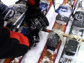 | さて、近世シール事情 盛んに議論されてきたシールの諸々。 昔は差し迫ったものがあったけど、最近は大体の対策と傾向が掴めてのんきなものの旦那です。メモ風に近世シール事情をまとめてみました。では、独断と偏見に満ちたシール考察をどうぞ。 反論、付け足し大歓迎です。 1.取り付けシール?貼り付けシール? もう、取り付けシールは必要ありません。バイバイ秀岳荘シールです。 まず、貼り付けシールの糊の性能が向上して何度も付け剥がしが可能になったので、何度でも着脱可能という取り付けシールのメリットが無くなってきたこと。 次に、予備シールとしての取り付けシールの存在意義ですが、こちらもゴムバンドで糊の粘着力が無くなった貼り付けシールを、スキー板にしっかりと取り付ける事が出来るので必要なくなりました。 そのかわり、装備として最低6本のゴムバンドを携帯することをお薦めします。非常時にはソリ作りにも使える優れものです。 2.モヘア?ナイロン? モヘアの方が前方への滑り性能が優れていますので、お金に余裕のある方は高価なモヘアを選択することをお勧めします。 ナイロンでも別に困ったことはありませんが、アップダウンのある長距離ツアーなどでは疲労度に違いが出るかもしれません。 3.春先には、シールワックスを 必携です。一度シールが濡れて高下駄状態になってしまったら、それだけでツアーを中止したくなるくらいです。 ロウソクでも代用できるけど、すぐに効果が無くなります。塗りすぎると登れなくなるので注意。 4.で、どんな貼り付けシールを買えばいいの? 旦那は現在G3スキン(テールフック付き)を使っています。 http://www.genuineguidegear.com/telemark_climbing_skins.html 従来の貼り付けシールのアキレス腱はトップフックのゴムでした。ラッセル時に引っかけてシールを剥がしやすいし、ゴムが切れるトラブルに備えて予備も持つ必要もありました。 その点、G3のようなトップフックがシンプルなワイヤータイプのものは、トラブルが無くて良いです。 テールフックが必要かどうか?よく議論になるのですが、旦那は心配性なのでテールフック付きをチョイスしました。 これだけ糊の性能が上がれば、テールフックはもう必要ないかもしれないのですが、特に北海道など気温の低い所ではどうなのか?見極めが続きます。少なくとも、糊が弱くなった時にゴムバンドで応急処置するときには、テールフックがあった方が確実で便利です。 G3のテールフックは、着脱の際に金具がソールに当たって傷が付くのが難点かな。 5.シールの幅とトリミング カービング板の登場で、BCスキーヤーは新たに頭痛の種を抱え込みました。 腰のくびれた板にそのまま真っ直ぐなシールを貼り付けると、ソールが剥き出しの部分が出来てしまいます。 理想的なのは、十分幅広のシールを買ってきて、板の形状に合わせてトリミングする事です。 最近のファット板では十分にシール面積が稼げるので、ウエスト部分の幅に合わせたシールで問題ないという話もありますが、アイスバーンなどシビアな斜面をスキー板で登ることが多い方には、ちゃんとトリミングしたものを使用する事をお勧めします。 ただ、トリミングしてしまうと、一本のシールを複数の板に使い回すことがほぼ不可能になるんだよな〜。これも頭が痛い。トリミング作業も面倒だし・・ エッジを出すようにトリミングすべきかかどうか、これもよく議論になるのですが、旦那は絶対にエッジを出す派です。一度、アイスバーンの斜面をトラバースしたら分かります。 シールを付けたまま滑降する際にも、エッジを出していた方がコントロールが容易です。 6.シールの持ち運び方 常にシールに付属の台紙?みたいなものに律儀にくっつけて運ぶ人も居ますが、シールを糊面同士四つ折りにして畳み、懐へ入れる。これが”安田流”最強のシールの持ち運び方です。 しかし、これ以上糊の性能が上がるとこれも出来なくなるかも。 G3シールに付いてくるメッシュの台紙は、一見良さそうだけど吹雪いていると糊面に雪がくっつくという欠点もあります。それでも使いたい場合には長さを半分に切って、シールを二つ折りにして使うと具合が良かったですよ。 強者はテフロンシートを買ってきて台紙を自作しています。 他にも、海苔巻きみたいにシールを巻いて持ち運ぶという方もいらっしゃいます。 あと、何かあったけ?まぁいいや。近世シール事情のキモは、貼り付けシールの糊性能の向上と、ゴムバンドの活用の二点です。地味ですが画期的だと思います。 ファット板の大面積がそのままシール面積にも反映されているので、以前と比べてシールが効く効く・・最近のトレースは急勾配ですよ〜(^_^;)細板の人はジグを切り直した方が良いです。 ゴムバンド そり作り |