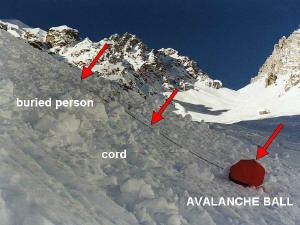 | 2.救出までのスピードが早い 雪面に浮いたボールから伸びるロープをたぐり寄せれば埋没者を発見できる。プローブも必要ない。 ビーコンの準備や捜索の時間が省けるので、その分だけ早期の救出〜生存が期待できる。これは大きなメリットだ。