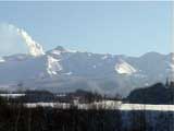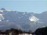| バーチャル三段山へようこそ! これは、1999年12月19日の三段山の様子を豊富な映像と撮影場所をリンクさせて紹介する試みです。 三段山へまだ行っていない人も、残念ながら行っても悪天候だった人も、このページで三段山を仮想体験してみてください。ちなみに、このシーズンでこの快晴に出会う確率は10回の山行で1回くらいでしょう。登山時間表記は、撮影しながらゆっくり登ったものなので、かなりゆっくりしたものです。 上左図が三段山白銀荘コース(夏道)のルート図です。大まかな標高線も入れてあります。 上右図がルート標高図です。三段山と呼ばれていますが、このルートでは登坂がきつい斜面が4カ所あり、便宜的に4段に分けた名称を用いることにします。 写真1:上富良野町市街地を過ぎたあたりから見た十勝岳連峰 写真2:左端が十勝岳。中央が三段山 写真3:山道を上がる途中からの三段山。右が崖尾根で、中央にピークが見えます |