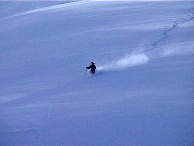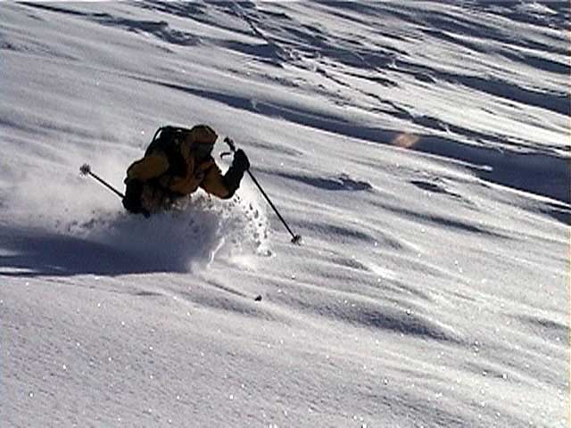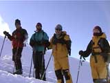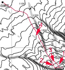 | いよいよ滑降です。視界が良ければ、自由に良さげな斜面を選んで思いっきり滑りを楽しみましょう(写真1,2)。深雪・クラスト・急斜面・緩斜面なんでも揃っています。ただし、雪の下に潜むハイマツには注意して下さい(写真3)。 参考までに、私が今までに出会った負傷事故地点をマップに記します。矢印1,2,4は捻挫。矢印3は骨折です。矢印3の地点から負傷者を下ろすのには10人以上の人手と大変な時間が必要でした。くれぐれもお気を付けて! バーチャル三段山に最後までお付き合いいただき、ありがとうございました。皆様のスキーツアーの何らかの参考になれば幸いです。 撮影に同行して下さった三段山クラブ、その他の皆様(写真4)。ご協力感謝いたします。 |