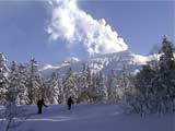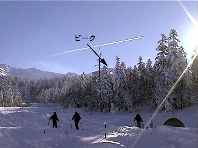 | 登り支度を整えて、さあ!出発です。 白銀荘の前のテントサイトを横切るようにして、伐採されたスロープを目指します。 登りはじめに急な法面があります。登りでも苦労しますが、下りでもこの存在を忘れると危険ですから、注意して下さい(笑)。 三段山のピークは、森の影からチラッと見える程度で、まだほとんど見えません。 登山口に向かって左手に、前十勝と噴煙が見えます。素晴らしい眺めです。 写真1:テントサイトを横切って法面へ向かう。ピークが木立の上に見え隠れしている。 写真2:一番目を引く前十勝。噴煙が上空の風の目安になる。白銀荘へ滑り降りると、たいていの温泉客が「あの山からおりてきたのかい?」と言って前十勝を指さす(気持ちは分かる)。 |