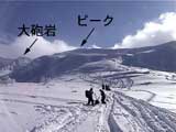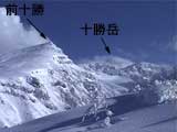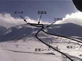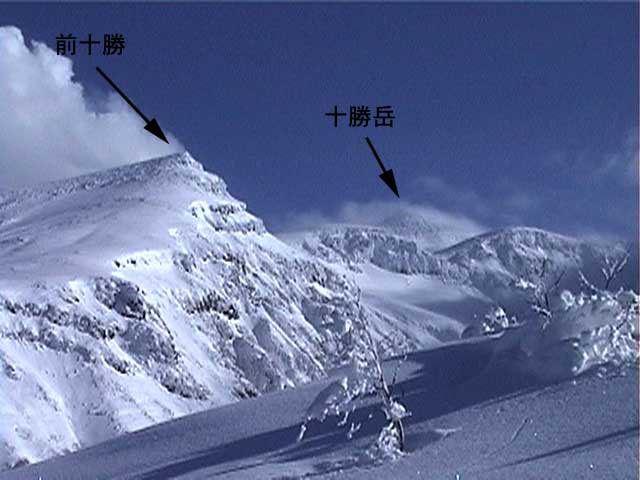 | 登山口から約1時間30分後、標高1350メートル付近で夏道コースと南西コースが接近する地点にでます。ここは広い台地状になっており、三段山の全容が良く見渡せる地点です。南西に富良野岳。南東に十勝岳も姿をあらわします。 ! ハイマツ注意! 写真1:三段山の全容 写真2:コース図を重ねたもの 写真3:富良野岳 写真4:前十勝と十勝岳 |