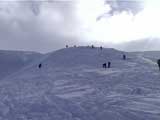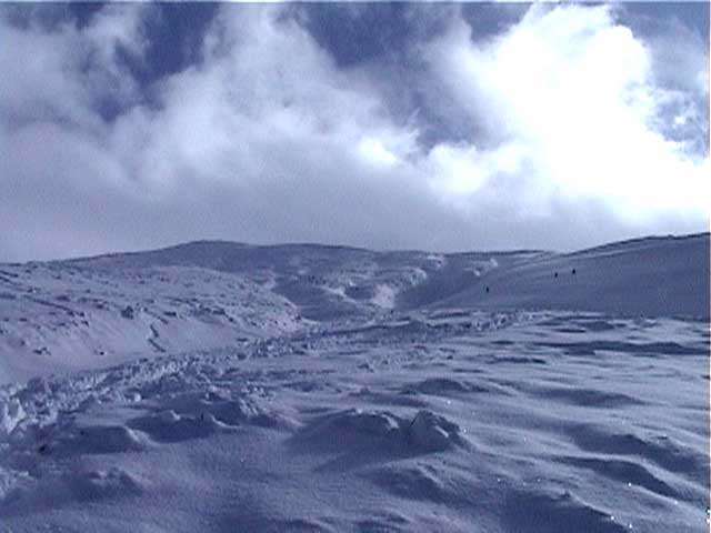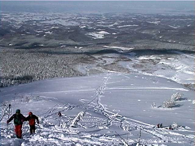 | 登山口から約2時間後、三段目に取り付きます。 標高図にも表れにくい比較的小さな斜面なので、三段目として認定するかどうか悩んだのですが、急斜面なので難所としての意味合いも込めて三段目としました。この付近はハイマツが潜んでいることが多いので注意して下さい。三段目に向かって左側の谷を詰めると、登坂しやすいことがあります。 視界不良時の滑降では、ここから北東の谷へ迷いやすいので注意してください。 ここを越えると、通称”廊下”と呼ばれる谷に入ります。 !クラスト注意! !ハイマツ注意! |