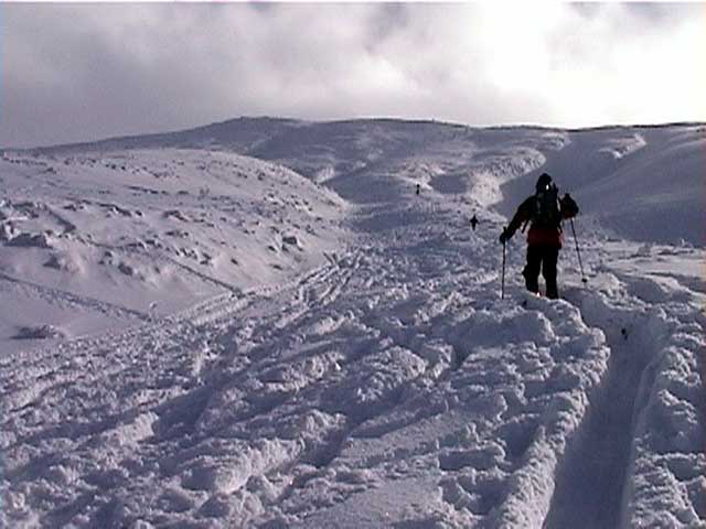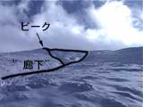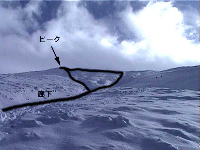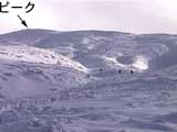 | この付近は、緩やかで浅い谷が山頂直下まで続いているので、通称”廊下”と呼ばれています。 風をしのげるので登坂中の休憩にはもってこいの場所です。悪天候で登頂が無理だと判断した場合、引き返すのも大抵このあたりです。 廊下の中はハイマツが少なく、たいてい雪質も良いため、滑降時には快適な滑りを楽しめるでしょう(写真では、すでに大勢のスキーヤーが滑っていてかなり斜面が荒れています)。廊下の西側の尾根も良好な滑降スポットです。登りながら鵜の目鷹の目で滑降ルートを良く吟味しておきましょう(笑)。 この先で、コースは大まかに二つに分かれます。 |