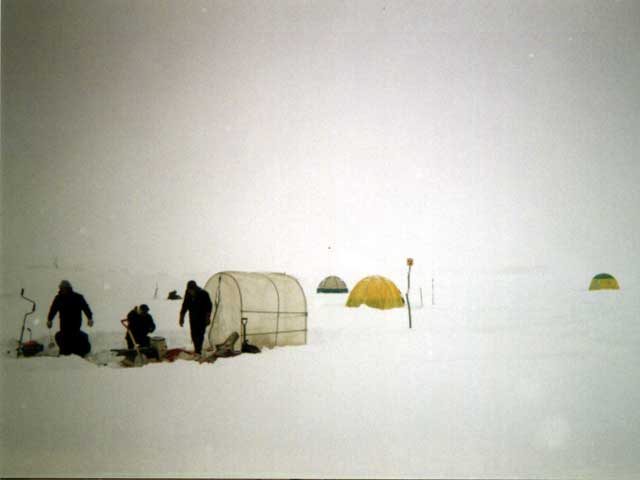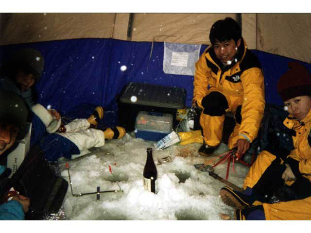 その上にワンタッチ式の床の無いタイプのテントを設営し、マットを穴の周囲に配置して準備完了。テント内の気温は5度と思ったよりも暖かい。いよいよワカサギ釣りの開始である!(写真4)ちなみに写真中央が銘酒天狗舞である。