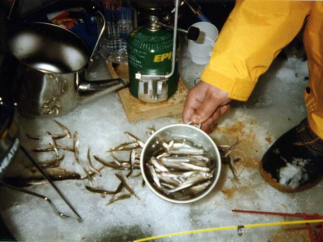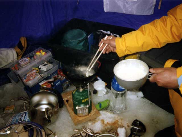 いくらでも食べられたのだが、残念ながら今日はそれほど釣れなかった。H舘さんは先週300匹ほど釣り上げたと言うが、今回は5人合わせても100匹程度だろう。でも釣果は関係ない。貴重な体験であった。妻も大喜び。「三段山よりこっちの方が良いわ」とかのたまう始末。これはチトまずい。