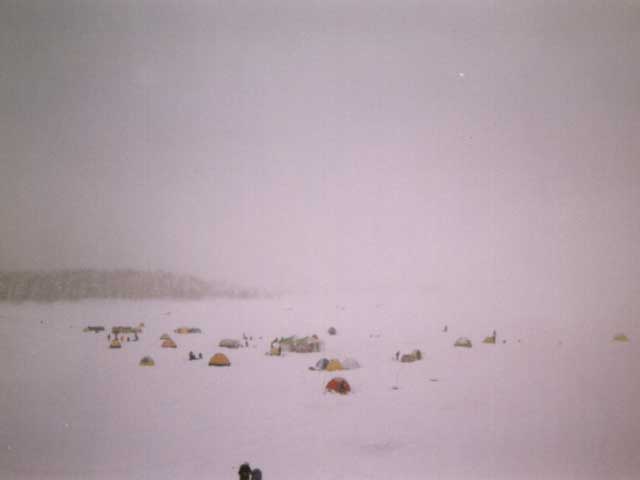 そしてまだ暗い湖の氷上には灯籠流しのように美しく、灯りを抱いたテントが点々と見える。その数は100張りくらいだろうか?いやがおうにもテンションが上がる。