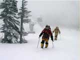ここで、駐車場でもちらっと挨拶した、旭川労山の二人連れの山スキーヤーと出会う。「三段山クラブのHPを見ていますよ」とのうれしいお言葉。この先の小ピーク(マイクロウエーブの反射板が建っている)までピストンしてきたそうだ。この方たちは登りも早いが下りも早い!見事なシュプールを残して、あっという間に降りしきる雪の中に消えていった。