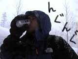 さらに少し遅れて到着したボーダーの女性達と合流して盛り上がる。しかし雪の降りが強くなってきた。気温もかなり低下してきており、ビールを飲みながら震えが止まらない(馬鹿ですね)。妻特製のブランデー入り紅茶で少し体を温める。K君はワインラッパ飲みだ!アッパレ!でも風邪大丈夫?