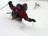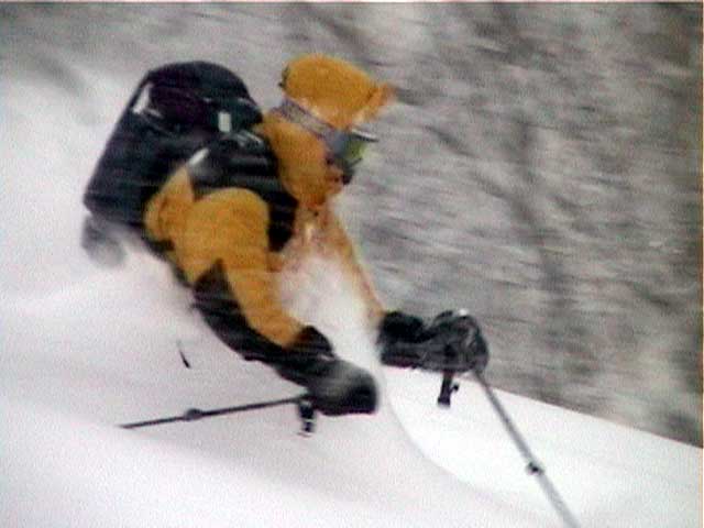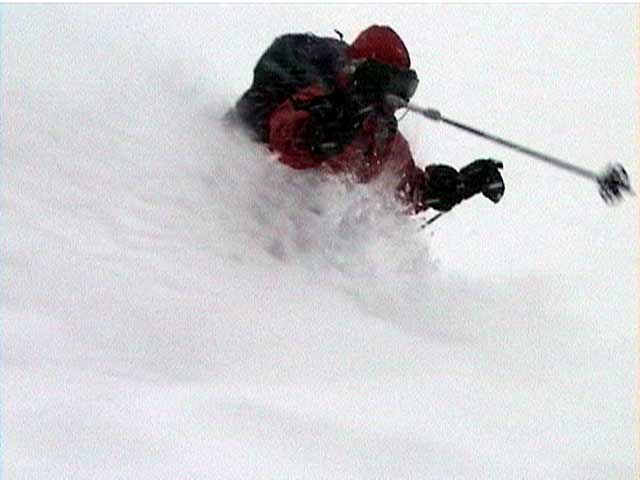 雪煙が顔に吹き付け、ゴーグルなしでは目が開けられない。口に雪が入りむせる(喜んでいる)。このソフトな雪質は捻挫にも優しい。ほぼ支障なく滑って来れた。
