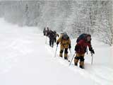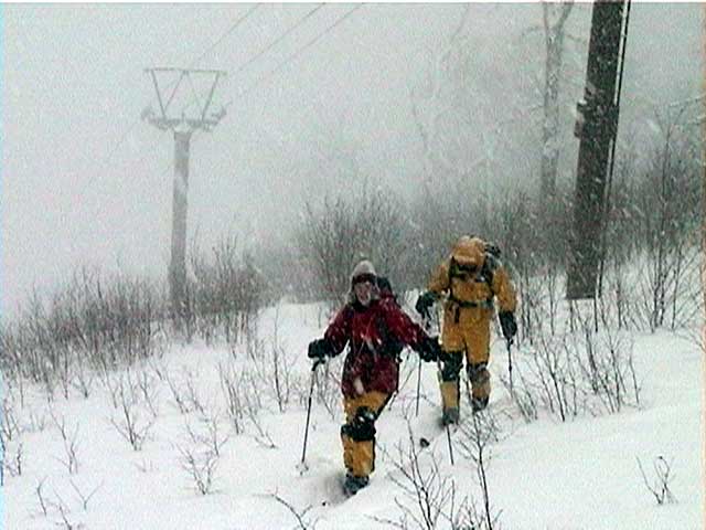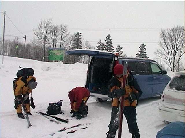 雪崩れビーコンを装着し、スコップ、ゾンデ棒を携帯する。これらの準備に手間取り我々が最後発。車の中でぐーぐー寝ていて寝ぼけていた妻にも、やっとエンジンがかかる。