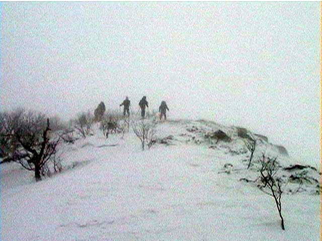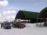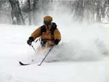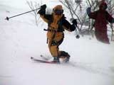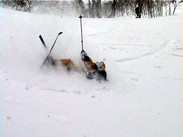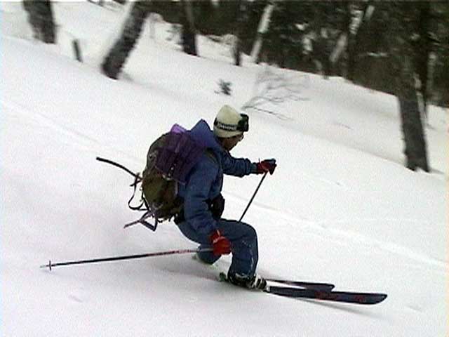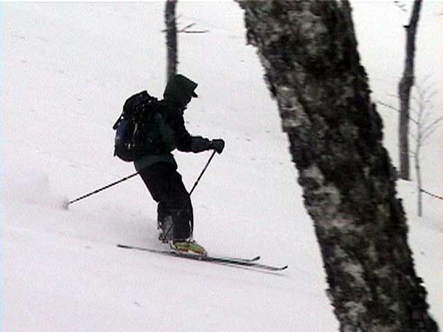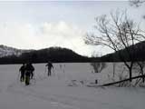 | 数日前に、長谷川さんから狩振岳へ行くという話をきいていたのだが、参加を表明したのは、ぎりぎり直前になってからだった。 あまり狩振岳という山名を聞いたことがなかったので不安だったのだ。しかし、このような機会が無くては滅多に登れる山でもなさそうなので参加を決意した。 それに冬の日高には一度も入った事がなかったので、日高の雰囲気が少しでもつかめるかな?とも期待したのだ(注:登山の当日に、ここは日高とは言えないと長谷川さんに指摘されてしまった(泣))。 初めての山に入山するというのは緊張するものである。 とりあえず、地図を入手しないと話にならない。1/25000か、なければ1/50000を入手しよう。 出発の前日に札幌で地図を探す。しかし、札幌秀岳荘には無かった。ICIにも無かった。?店員さんに聞いてみよう。「すみません、狩振岳なんですが・・・」「え?そんな山知りませんねー。地図もないですよー」 結局大型書店で入手できたが、なんだか嫌な予感がしてきた。山じゃないですよ岳ですよ?それにしては、あまりにも知名度が低すぎませんか?・・・杞憂だと良いが・・・ 結果:登頂成功。でもヘロヘロ。 天候:晴れ〜吹雪 気温:-2〜-9度 積雪:十分 雪質:基本的に悪雪。 コース:中尾根 新夕張駅で、7時30分に長谷川さんと落ち合い。上トマムで、9時15分にN川夫妻やadachiさんと集合する。ここで、はじめてadachiさんとお会いする。うーん。ベテランのオーラが・・足手まといにならないようにしなければ。今回の構成は、テレマーク3名。山スキー4名。最近の我々のツアーにはめずらしくテレマークが少数派だ。ここでも嫌な予感が・・・ 9:55 狩振岳麓の牧場 天候:晴れ時々曇、無風 気温-2度 雪質:最中状態 ラッセルなし 当初予定していた林道は除雪されていなかったため、若干距離が遠くなったが、近くの牧場からアプローチすることになった。長谷川さんが交渉して、牧場の干し草ヤードに駐車させてもらう(写真1)。ここから狩振岳のピークがよく見える(写真2) 尾根へとりつくまで、谷を2つほど越えながら平地をトラバースする(写真3)。途中何度かスノーモービルの痕を横切った。 やっと尾根にとりついて登り始めるが、灌木が濃い(写真4)。登りでも相当じゃまだ。おまけに雪が悪くて下りが思いやられる。上部に期待しよう。 登るにつれ、だんだん樹木が立派になってきた(写真5)。久しぶりに濃い樹林帯を歩けて、とてもおもしろい。途中何度か凍裂して太い幹に一直線に割れが入った木を見かけた。このあたりは、北海道でも有数の厳寒地なのだ。 でっかい猿の腰掛けを2個も見つけた(写真6)。人も腰掛けることができそうだ。 傾斜が急になってきて、やっと灌木が少なくなってきた(写真7)。たしかに巨木の森だ。ブナ、ダケカンバ、エゾ・トド松の混合林が美しい。雪質も良くなってきたが次第に天候が悪化し、吹雪いてきた。 ハイテク登山を標榜する”三段山クラブGPS普及係”としては、このような未知の山でこそGPSを活用してアピールせねば!と、意気揚々と(ムキになって)現在位置を割り出す。しかし山のベテランにとっては、ちゃんとわかっている現在位置を確認したにすぎない(相手が悪すぎた)。でも、「ほー」とか言われてうれしい(笑)。よーし、次はカシミールで3Dルート図を作成するのだ! 11:50 標高1100メートル付近 天候:吹雪 気温-6度 雪質:堅めのパウダー 悪天候なため、稜線にでる前に昼食を済ませることにする。三段山クラブ(特に妻)はかなりグロッキーだ。私は、かなり皆さんの足を引っ張った自信がある! 「三段山クラブって言うから、三段山をガンガン登る一団かと思ったよ」と、adachiさん。「いえ、ちがうんです。ぼくら三段山をなめるように登って、テレテレ降りてくるだけの軟弱集団なんです」とか言いながらビールを飲んでいる私。反省の色なし!困ったものだ。12:10頃出発。 稜線に上がると吹雪で視界不良、しかも雪はクラストしている。スキーアイゼンが欲しいところだが、当然テレマークスキーには装着できない。 そんな中、確固たる足取りで(しかも早い)リードする長谷川さんとadachiさん。さすがだ。 12:50 山頂到着 天候:吹雪 強風 若干視界不良 気温-9度 雪質:パウダー、クラスト、最中の何でもあり状態 樹木がなく、平らで吹きさらしの山頂だった(写真8)。 標識もなく周囲は視界不良で真っ白。薄い雪の下のハイマツに足がぬかる。 登頂の喜びに浸る間もなく、到着と同時に、皆黙々と撤収準備にかかかる(写真9)。 13:00 滑降開始! やっぱり、雪が悪いー。クラストしているかと思えば、パウダーで、パウダーかと思えばモナカ状態になり、その変化にぶつかるたびに、ぼくらテレマーカーは顔から転ぶ、転ぶ(写真10)。 その点、山スキーヤー(もちろんレベルが高い)は雪質の変化に強い。皆さん安定して滑降していくので、くやしいなあ。とか思っていると、また転ぶ。(写真11:長谷川さん、写真12:adachiさん、写真13:N川さん) 尾根から少し下の樹林帯は