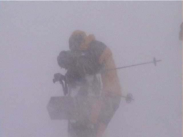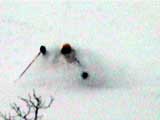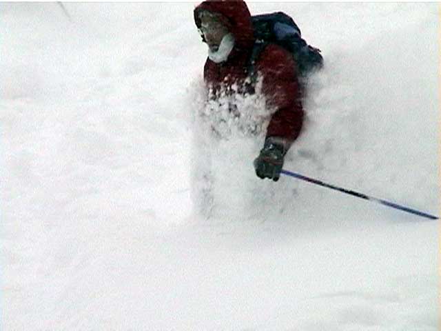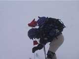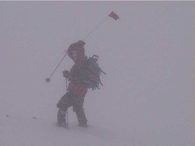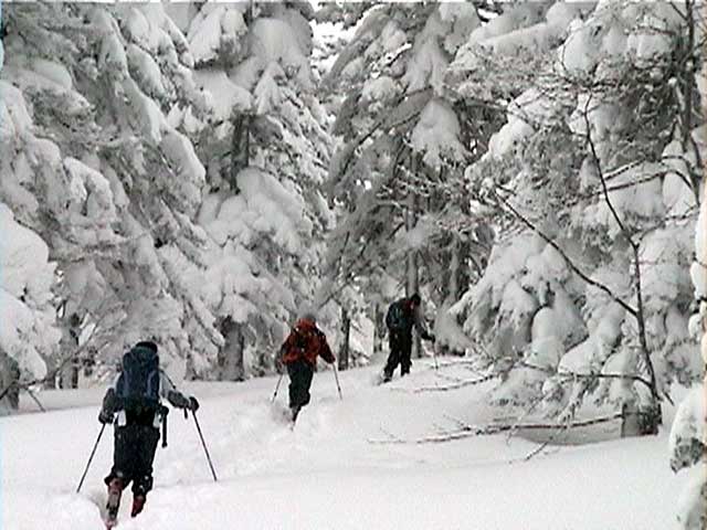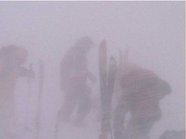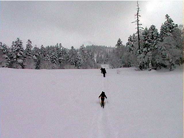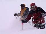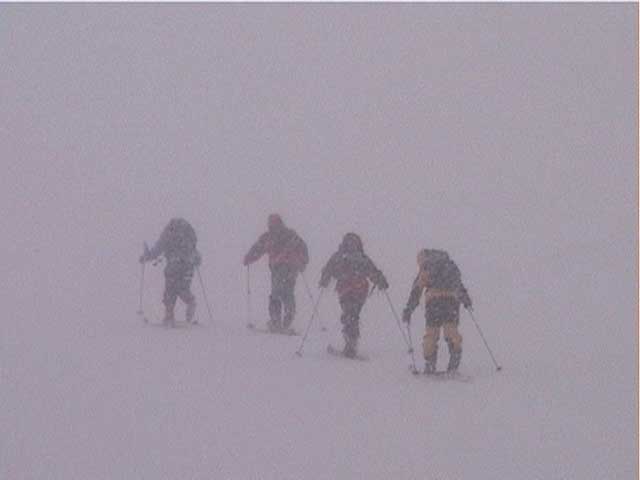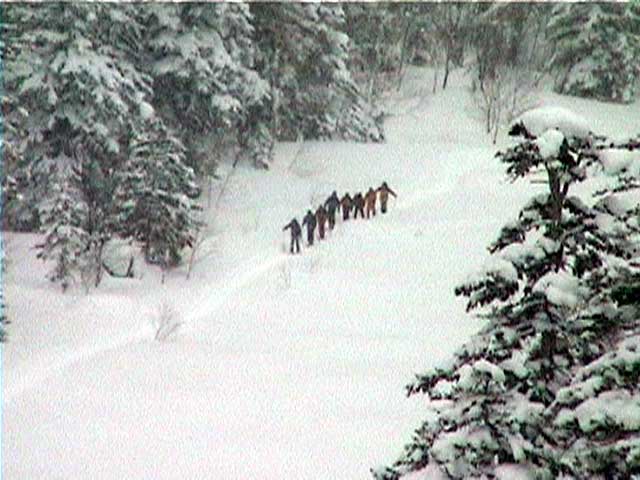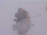 | 本日の悪天候の犠牲者は、場慣れしている私と妻とSさんの3名のテレマーカー。そして、クロカンで鍛えていて滑降テクも高い山スキーヤー2名。さあ、皆で吹雪へゴー! 結果:登頂成功 天候:曇り〜ひどい吹雪 気温:-5〜-15度 積雪:十分 雪質:若干重い深雪、ところどころ悪雪。 コース:夏道コース 10:12 白銀荘 天候:曇り無風 気温-5度 三段山の麓は風も無く、気温も高め(写真1)。しかしこれにだまされてはいけない。上空はかなり風が強そうだ。しっかりデポ旗を持ち、アバランチビーコンも装着する。 ここ何日かの雪が膝近くまで積もっていたが、先行者の立派なトレースをたどることができた(写真2)。 2段目あたりから風雪が強まり、三段山は野生の本性をむき出しにし始めた(写真3)。 ここらで対風雪装備を固めておこう。帽子とフェイスマスクを被り、フードで固める。 12:00 三段目 天候:吹雪 強風視界不良 気温-12度 次第に視界が悪くなる。3段目からデポ旗打ち開始(写真4)。 視界との兼ね合いを考えながらデポ旗を最低限の数で効率よく打つのだが、帰りにその読みが当たるかどうかが楽しい。 登りはめったに迷わないが下りが怖い。三段山では、たいてい下り方向が風上となるので、よく視界が奪われるのだ。 雪も重たくて難儀する。このあたりではラッセル跡は強風であっと言う間にかき消されてしまう。 先行者が4段目手前で撤収準備をしていた。すでに視界は30メートル程度で気温も急降下している。普通はここから撤退するところだろう。 でも三段山なら、相当な悪天候でも登頂が可能だし、とても良い訓練になる。さあ吹雪も楽しもう! 1時に合流することになっていた秀岳荘ツアー一行に、合流できない旨連絡しようと携帯電話から電話をかけてみたが、白銀荘のカウンターと数語話しただけで金属音が鳴りっぱなしになり、使用不能になってしまった。舌打ちして電源を切る。 尾根に出るとさらに猛烈な風になり、帰路に崖尾根へ転落することを警戒してスキーをデポした。ここからはストックだけ持って坪足で登る。ゴーグルを着用しないと目が凍り付く(睫毛が氷結して目が開かなくなる)。 12:55 山頂 天候:ひどい吹雪 強風視界不良 気温-15度 よろめくようにして山頂に到着。標識に抱きつく妻(写真5)。 視界は10メートル程度。時々突風が身体を突き飛ばす。もちろん登頂と同時に即下山だ。 「降りるぞー!」と大声で怒鳴る。今日はさすがに山頂ビールは飲めない(苦笑) 尾根上で大急ぎでスキーを装着して降りたが(写真6)、視界は一面真っ白でバランス感覚が狂う。特に先頭を行くと、滑っているのか止まっているのか、はたまた空を飛んでいるのかわからなくなる。そのうち急に雪面に顔面を打ち付けられて、滑降中に転んだことがわかるといった具合だ(これを雪酔いというらしい、ひどいときには本当に吐きそうになる)。 はぐれないようデポ旗ごとに人数を確認しながら降りていった。まさしく地獄のような状況だったが、たまには吹雪を楽しもう!デポ旗とダンスするsさん(写真7)。 丁度良い機会なので妻にコンパスの使い方の訓練をさせる。今度、もっと余裕が出てきたらツエルトを張ってみようか。 とても深い雪の中、顔まで粉雪を吹き上げながら順調に高度を下げてきたのだが(写真8〜10)、途中二段目と三段目の間の斜面で、Sさんが転倒し捻挫してしまった。今日は、雪が若干重いうえ部分的に堅い吹き溜まりがあり、そこへ突っ込んだらしい。吹雪を楽しむのは良いが、こんな落とし穴もあるので油断はできない。幸い軽傷だったためそのまま降りたが、今年の三段山は負傷が多い。 かなり標高を下げてほっと一息ついているところで、パークボランティアの方々と出会い、スノーモービル問題について意気投合する。 樹林帯の中でビール&昼食を取る予定だったが、捻挫の応急処置を優先してそのまま白銀荘へ下ることにした。 しかし、その途中で異様な一団が登ってきた。妙に密な隊列を組んでいて不気味である。彼等はいったい何者だ? 続きは次号、刮目して待て!(なーんて) 注) 決してお勧めはしないが、あえて厳しい自然環境に身を置いてみると、意 外と楽しい。ただし油断はないように、デポ旗、コンパス、地図、GPS、無線機などの装備で、しっかり安全を確保するのが前提である。 |