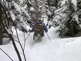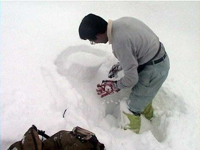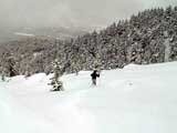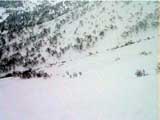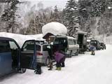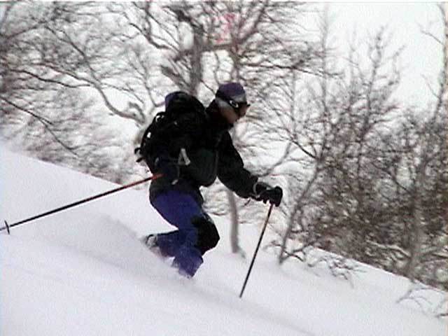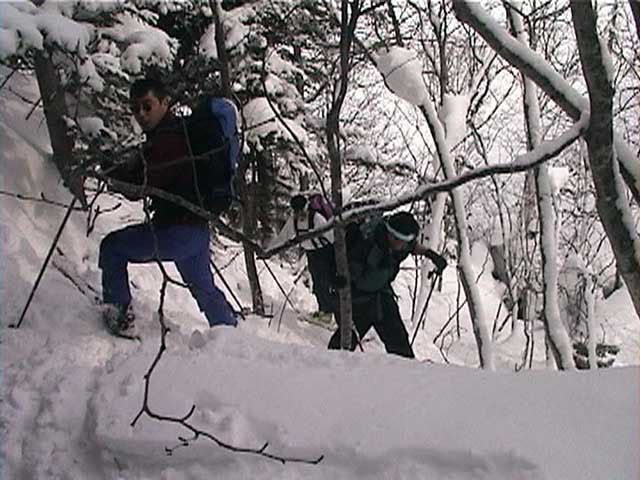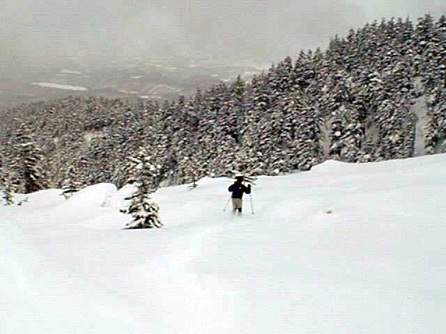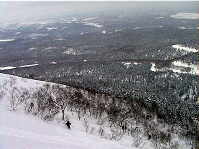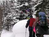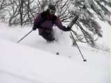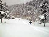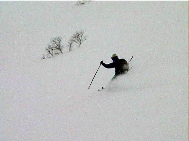 | 本来は美瑛富士へ行く予定だったのだが、天候が不安なため富良野岳ジャイアント尾根に変更した。 ジャイアント尾根については、長谷川さんのページに地図を含めた詳細がありますので、こちらを参照してください(^_^)。 結果:1560m地点より、谷へ大滑降 天候:曇り 気温:-2〜2度 積雪:十分、足首くらいまでのラッセル 雪質:若干重いパウダー、樹林帯の中は良好 コース:バーデン上富良野〜ジャイアント尾根 9:17 稜雲閣駐車場(翁コース) 曇り小雪無風 -2度 雪質良好:パウダー N川夫妻を待つ間、足慣らしに翁コースを楽しんだ。 ノートラック、良質なパウダーを味わえて大満足(写真1,2)。 9:45 バーデン上富良野到着 10:03稜雲閣を車で出発 10時に稜雲閣でN川夫妻と落ち合い、いよいよ本日のメーンイベント。富良野岳ジャイアント尾根へ向かうことにする。 いつもは尾根を上がり尾根を降りるのだが、今回は長谷川さんを迎えているのでそれで済む訳がない!北尾根とジャイアント尾根の間の谷向かって大滑降を行う予定である(写真3)。 10:34バーデン上富良野出発 曇天無風 2度 バーデン上富良野前のバス停付近は縦列駐車ができるように除雪されているので、こちらに駐車して(写真4)砂防ダムへ向かう。 この日は沢山の車が駐車していたのだが、なぜか分からない。北尾根経由で富良野岳ピークへ向かうパーティのものかと思ったが、トレースは無かった。 丁度出発するときに、札幌と東京から来たという3人組テレマークパーティと出会う。目的地も一緒とのことで楽しみだ(ラッセルが楽できる)(^_^;)。 このコースには、難所が二箇所ある。川越えと北尾根取り付きの急斜面である。 今回はスノーブリッジがあったため川越えは楽だったが、北尾根取り付き急斜面で早速私は体力を使い果たした(写真5)。情けない・・・。 北尾根をコンタ沿いに巻きながら、北尾根とジャイアント尾根の間の谷を越える。 11:371050m 曇天無風 視界良好0度 軽いラッセルを、なんとなく別テレマークパーティと交代しながら(写真6)、バテバテな私はスーさんのシールを補修しながらゆっくり登らせてもらった。 ジャイアント尾根の尾根筋に出たところで休憩。気温が高くて大汗をかく。 12:30 1330m 昼食 曇天小雪無風 -1度 視界良好 森林限界を超えるあたりで(写真7,8)、風を避けて昼食を取った。私は当然ビール。 長谷川さんは、谷への滑降が可能かどうかを判断する弱層テストに余念がない(写真9)。 普通はこのあたりから雪面がクラストしているのだが、今回は不思議とパウダー状態だった。これならスキーを装着したままポコ岩まで行けそうである。 しかし、視界はここまでは良好だったが、この先はガスが濃くなってきたので、十勝岳で懲りた視界確保を第一優先に滑降開始地点を定めた。 別テレマークパーティは、一心不乱に登っていってガスの中に消えていった。あとで聞くと沢の源頭まで詰めてから滑降したようだ。凄い! 13:36 1560m 北尾根側の谷へ向かって滑降 眼下には涎のでそうな大斜面(写真10)。今時期の割には雪質も悪くない。斜度十分(ちょっと十分すぎるゾ!)。雪崩は?長谷川さんのチェックでは大丈夫。えーと、ビールで景気付けして気力も十分。足りないのは私の体力とテレマークテクニックだけだ! とりあえず、大斜面へ落ちてみよう!ゴー!! ・・・ ゴーって、言うより、ゴロゴロ落ちた(私)。 何回転かした後、買って初めてリリースが開放した。ああ、挫折感。でも、ちゃんと作動するんだねリリース。これはちょっと安心。 他の皆さんは、こんな感じでイカしていた(写真11,12)。私は登りバテバテ、下りゴロゴロ。 スーさん、得意なアルペンで乗り切っちゃってずるいよ。やっぱり私のようにテレマークポジションで玉砕しないと。(^_^) 200メートルほど下ってからトラバースして尾根へ戻り、また良い斜面を見つけてトラバースを繰り返した(写真13)。 樹林帯の中は適度な樹林密度の中、軽快な雪を蹴散らして降りていける。楽しい(写真14,15,16)。 15:00バーデン上富良野到着 曇天 -2度 いやあ、いい汗をかいたなあ。別テレマークパーティとも丁度合流して、和やかな雰囲気が漂よう。 さらに、三峰山の麓からずっと降りてきたという、スキー・ボーダー混成部隊とも一緒になった。え?稜雲閣までヒッチハイクで戻るの?うーん。君らを乗せてくれる車がいるかなあ。まあ、健闘を祈る!(後で白銀荘で一緒になったときに話を聞くと、Vサインをしながら「若い女性の車に乗せてもらった!」とのこと。うーんやるなあ)。 この後はお約束の白銀荘露天風呂ミーティング&ビデオ反省会。一番反省する必要のある私は、幸いビデオに写っていないので(当たり前だ!)超ラッキーであった。 今シーズン中にもう一度くらい行きたい、富良野岳ジャイアント尾根でした。 |
