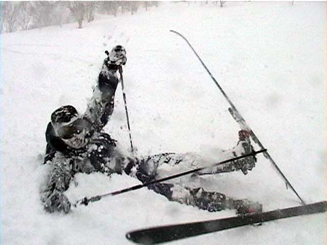 どうやら心のブレーキがブッ壊れたらしく、常にノーコントロール・オーバースピードで落ちていき、大クラッシュで、やっと止まることを繰り返す。転び方も半端じゃない。3回転くらいもんどり打ちながらゴロゴロ転がり落ちる(写真3)、スキー板は外れる、ビンディングのヒンジが曲がる。たしかに、スピードや傾斜に対する恐怖心は克服できているが、克服しすぎである。