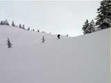 翁コースの途中30度くらいの急斜面で、まずAさんが誘発して幅5メートル長さ25メートルくらいの雪崩。誘発した当人は転倒後に雪崩に巻き込まれて少し流されたが、自力で脱出。しかしこの斜面は短いので危険性は感じなかった。皆で雪崩を誘発して楽しんだという感じ。