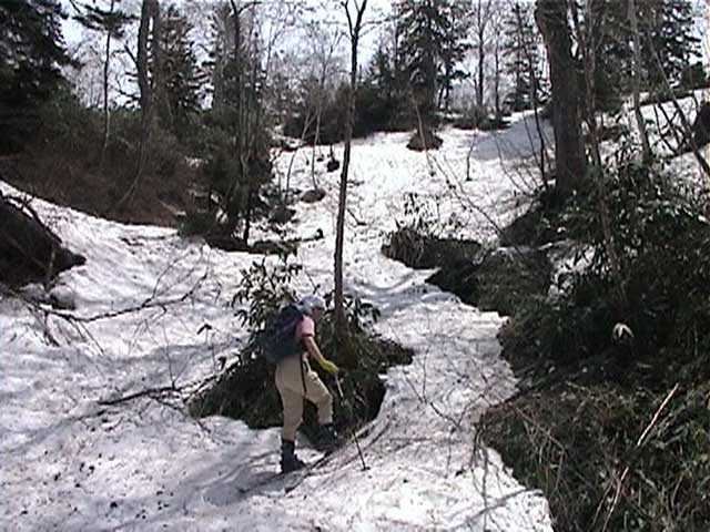 それでも10分ほど歩くと待望の雪が現れて、スキー登高が可能になった(写真3)。三段山の藪漕ぎと比較すると雲泥の差で旭岳の勝ちである。