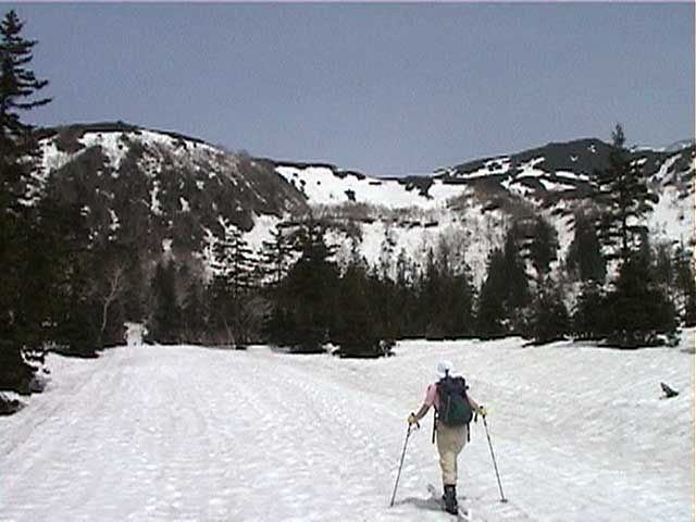 忠別付近からみた旭岳(写真1)。森林限界の上にはあまり雪が無かった。まあ、これは予想していたことだ。問題は樹林帯の積雪量である。