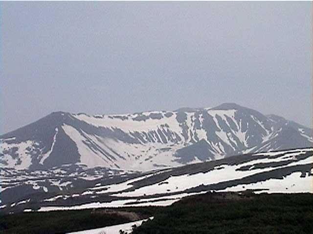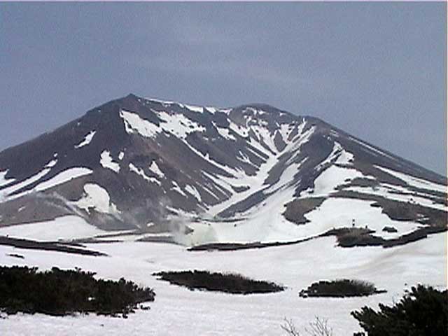 やっと、旭岳本峰にお目にかかれた(写真5)。当麻岳、安足間岳(写真6)もよく見える。素晴らしい眺望だが、雪の少なさには驚いた。適当な雪渓を見つけて遊ぼうかと思っていたが、断念する。
