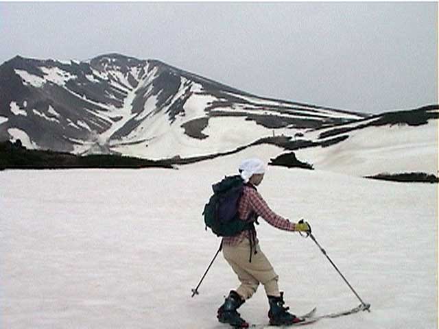 地獄谷も頂上からの滑降は無理だ。これから楽しめるのは、旭岳北斜面くらいだろう。その北斜面への道も雪が分断されているので、スキーをかなり担がなくてはならない。