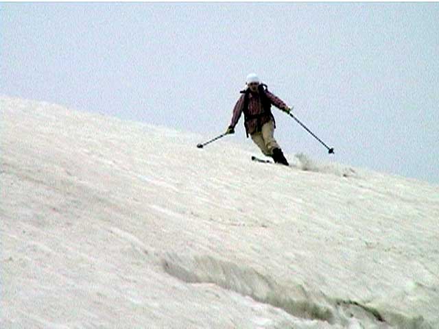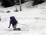 特に盤の沢の滑降は快適だった。ブッシュが少ないので思いっきりぶっ飛ばせる(写真9,10)。あー楽しいなあ!でもお楽しみはここまで。あとはだらだらとした斜面をひたすら降りるだけ。そのうちブッシュが濃くなってきておしまい。アッという間のお楽しみ終了でした。