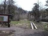 登山口の様子(写真2)。すっかり木道が顔を出し、水芭蕉が咲いていた。やはり、ここ何日かで急速に雪解けが進んだようである。ここをスキーを担いで歩くのか・・・(げんなり)。