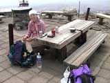 ロープウエイ駅側の展望台には、なぜか7〜8人の普段着の人がたむろしていた。どうやら、ロープウエイ工事の関係者のようだ。「よくやるよ・・」といった目でこちらを見ていた(^_^)。昼食はカップラーメンとおにぎり。そして、もちろんビール!(写真7)