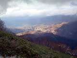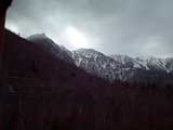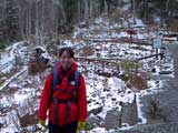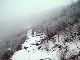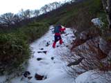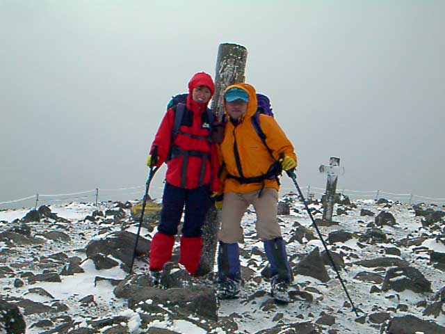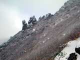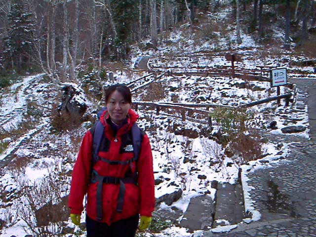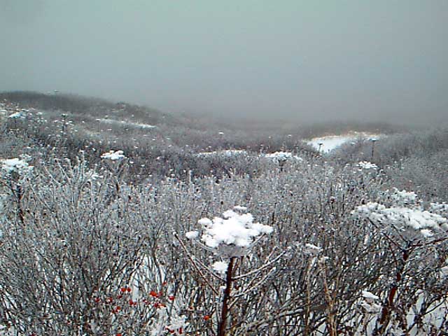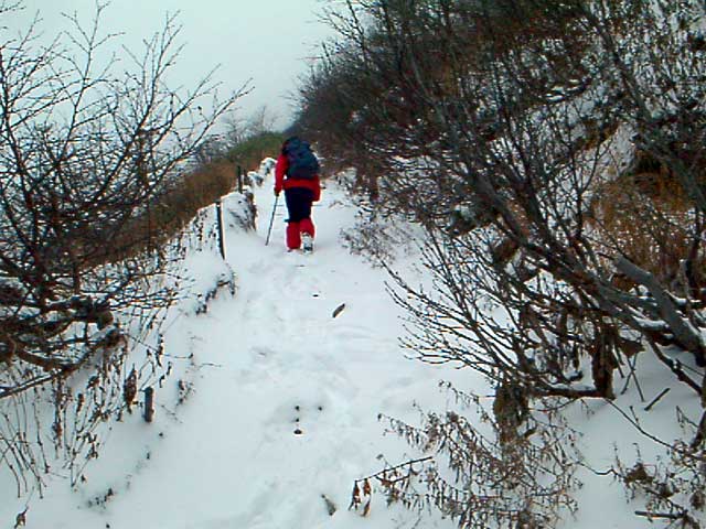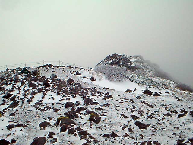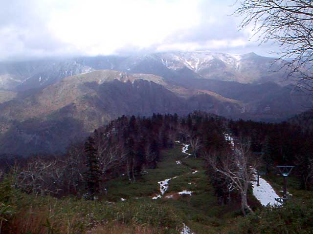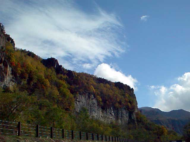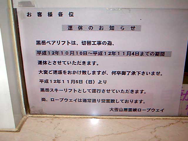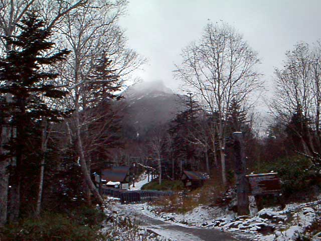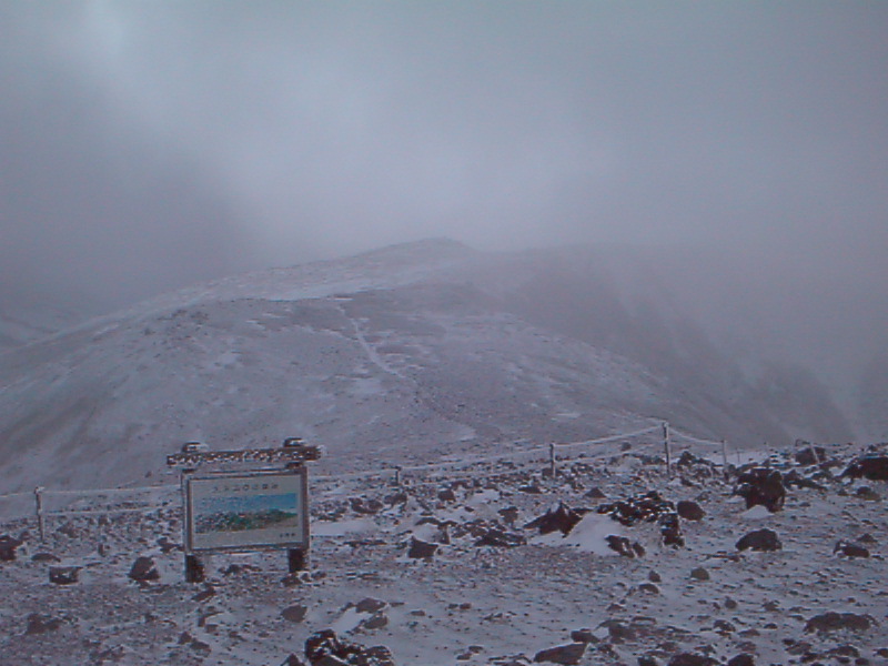 | 結果:黒岳登頂 天候:曇り時々晴れ時々雪 風速:2m〜10m 気温:9度〜-2度 11:45 層雲峡黒岳ロープウエイ駅 天候:曇り時々晴れ 風速2m 9度 素晴らしい紅葉に彩られた層雲峡(写真1)に到着したのは、お昼近くであった。 旭川を何時に出発したのかは、あえて書かない。まあ、良いのだ。黒岳は7合目までロープウエイとリフトを利用できるので、そこから1時間で山頂が踏めるという、超お気楽山だからである。 と、思ったらロープウエイ駅にこんな張り紙が・・・(写真2) 「運休のお知らせ 黒岳ペアリフトは、切替工事のため、平成12年10月10日〜平成12年11月4日まで、運休とさせていただきます。 平成12年11月5日(日)より、黒岳スキーリフトとして運行させていただきます。 尚、ロープウエイは、通常通り営業いたしております。」 ガーン!これで、まるまる往復2時間のロス。ロープウエイの最終が17時。嫁の顔を見ると明らかに登頂に対する戦意を喪失している!急がなくては・・ 12時発のロープウエイに慌ただしく乗り込む。ロープウエイに乗ると、雪化粧した山々が見えてきた(写真3,4)。 12:10 ロープウエイ5合目駅より出発 気温:4度 登山道を登ると二時間半かかる道のりも、ロープウエイなら10分で到着である。 ロープウエイを降りたとたんに、下界との温度差に身を震わせた。駅舎の外は、白銀の世界・・・とまでは言わないが、綺麗に雪で薄化粧されている(写真5)。 駅舎内で入山届けを記入したが、本日は登山者無し!であった。普段はとても登山客の多い山なだけに、多少不安がよぎる。 リフトでは張り紙の通り、すべての搬器を降ろして掛け替え工事を行っていた(写真6)。 この工事は、滑車の位置を夏向けの高さから冬向けの高さへ切り替えるもので、この季節に恒例のものである(すっかり忘れていた)。 その先に黒岳のピークがうっすらと見えて、登頂への意欲がかき立てられる。 リフトの直下を登ろうとして作業員に叱られ(^_^;)、向かって右手の登山道を辿るが(写真7)、沢状に荒れていて大層登りづらい。まったく、リフトの運休が恨めしい。 振り返ると層雲峡の渓谷とニセイカウシュッペ山や8月に登った比間奈山が見える(写真8)。 12:55 7合目リフト終点駅 |