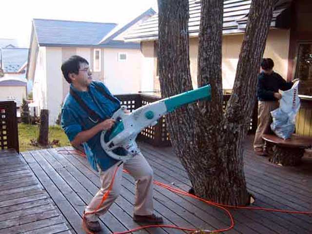 さっそく、登山前のウォーミングアップと称して、カッコイイ庭の葉っぱ掃除機を掲げ、「エイリアンII!(^_^;)」とか言って気炎を上げる私(写真1)。馬鹿である。