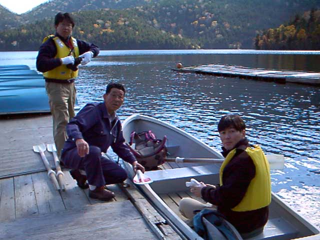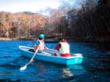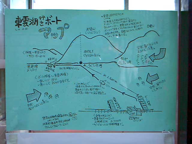 船着き場へ行くと、現在遊覧船は対岸へ人を降ろしていないという。東雲湖まで湖岸を歩くというのも、なんともだるい。困っているとポスターを見つけた(写真3)。なーんだ。手こぎボートで対岸へ行けるじゃん。おもしろいっ!一時間千円という料金が気になったが、俄然盛り上がった私達はいそいそとボートへ乗り込む(写真4)。