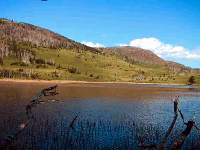 湖畔へは、少し藪を漕いで降りる必要がある。間近で見る東雲湖はさらに美しかった・・・(写真8)。