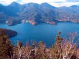 神秘の湖、然別湖に到着(写真2)。正面に見えるのが"くちびる山"こと天望山。うまく湖面に山のシルエットが映ると、見事なくちびるに見えるのだ。