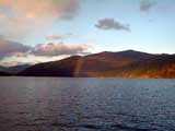だいぶ待たせてしまった、もり・あかさか氏に詫びながら、湖畔を振り返ると夕空の下に綺麗な虹が架かっていた(写真13)。