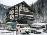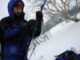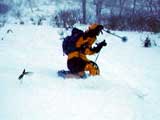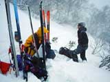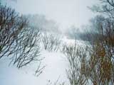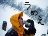 | 黒岳スキー場が、三週間遅れでオープン!このニュースを知った旦那夫婦は、早速黒岳攻略作戦を開始した。 目的は黒岳の森林限界までシール登攀し、その後豪快に滑り降りること。 前の日はGPSにウエイポイントを入力したり、スキーの調整などを行っているうちに、すっかり気持ちが高ぶってしまい寝るのが遅くなってしまった。 10時00分:(遅い・・) 旭川出発(^_^;)。どうも他に同行者がいないと、緊張感をなくして出発が遅くなる傾向がある。天候は曇天。気温0.1度。 行きの車内では、妻がずっとギターを掻き鳴らすまねをしながら歌い続けており、完全に舞いあがっている様子。そのうち層雲峡にさしかかってからは、突然「ちゅーじょーせつり!」とか叫び始めた。そういう時はにっこり笑って「そうだね」と答えてあげるに限る。 11時30分: ロープウェイ駅到着(写真1)。いつのまにか雪が降っていた。思ったよりも車の台数も人も少ない。寂しい感じ。 ロープウェイ駅終点で入山届に記帳した。今日は5パーティほどが黒岳ピーク往復に入っているようだ。 12時30分: リフト終点到着。風は弱いが、雪が勢いを増してきた。GPSに現在地点をマークしてから、シールをつけて登坂開始。 積雪は。うーん。ぎりぎりオッケーかなあ。(写真2)を見て下さい。ブッシュを避けながらキックターンを多用して登る。 雪は軽く、ラッセルもなく順調に高度を稼いだが、30分ほど登ったところで、私のシールが剥がれる。メンテナンスはしっかりやったのだが、やはりリフトの終点でシールを貼りつけたのが失敗したようだ。それと同時に開放機構からビンディングが外れた。泣きっ面に蜂。冬山シーズンインでの典型的な素人トラブルである。なさけない。しかたがないので休憩を宣言して開放機構の調整と予備として持っていた秀岳荘オリジナルシールを取り付ける。 人が必死に作業している横では、妻が何がうれしいのか妙にはしゃいで、写真を撮ったりしている(写真3)。脳裏を「このあま!」という言葉がよぎる。 そこからさらに30分登坂。セミカービング板と秀岳荘オリジナルシールの組みあわせは最悪である。実によくスリップしてくれた。しかし、やはり非常時には役に立ってくれる秀岳荘オリジナル。ありがとう、秀岳荘。ありがとう、こひやまさん。 だんだん風と雪が強まり、視界も100mを切ってきた。妻のシールが剥がれはじめる。困ったぞ。返す返すもシールを暖かい場所でつけておけば良かったと悔やむ。 13時30分: 八合目の標識側で休んでいる単独行の山スキーヤーと出会う。山スキーヤー:「こんにちわ。まだ登るんですか?」旦那:「いやー、なんか雪も少ないし。風も出てきたし。シールも剥がれたから帰ろうかな。」結局八合目で引き返すことにした。いいかげんである! そこで弁当を広げながら、山スキーヤーとしばし歓談(写真4)。はるばる興部から来たそうで、先先週も三段山へ行ったが雪が無くてがっかりして帰ってきたとのこと。あれ?俺達と同じじゃん。旦那:「ひょっとして山スキーをルーフに乗せて、にが笑いしながら11時頃白銀荘から降りてきましたか?」スキーヤー:困惑しながら「ええ。」やっぱり!(三段山玉砕記参照)奇遇である。そんなこんなで盛りあがり、今年の雪の少なさを共に多いに呪って溜飲を下げた。ついでにビールで乾杯(写真5)。寒いので唇が缶にくっつく。 14時00分: 滑降開始。雪質は良いのだがブッシュが濃いので思いっきり飛ばせない。妻はブッシュに見事なラリアットを決められた。ビデオを持ってくれば良かった(^_^;)。ストックをブッシュにひっかけると危険なのでストラップに手を通さないように注意する。 そのうち、だんだんカンが戻ってきてブッシュを縫うようにターンできるようになってきた。それにしてもカービングの威力には舌を巻いた。他のスキーヤーが荒らした雪面をまるで新雪面のように乗り超えていける。妻も昨シーズンとは別人のような滑りっぷりだ(写真6)。しかし恐くなって腰が引けたとたんに転んでいるのがわかる。そこさえ克服すれば、ばたいていの斜面は降りてこれるようになるだろう。カービングおそるべし。 20分ほどでリフト終点へ到着。所々に布マーカーがついているし、トレースがしっかりしていたので、迷うことはなかった。 スキー場のゲレンデは荒れており、こぶが発達していた。やむ終えずリフト塔の真下をおとなしく滑る。やはり新雪斜面と比較するとおもしろくないし、疲れた。回数券が残っているのだがザックを背負ったままリフトに乗るのも面倒なのでそのまま山を降りる。 14時45分: ロープウェイ駅終点に到着。 ちなみにロープウェイの終発は15時30分。乗り遅れないように注意しましよう。 麓で公営温泉に突入。がらがらの温泉休養室で偶然テレマークの達人、I君やソリスト!のK君らと出会い、ビールを飲みながらしばし歓談する。 他にも鈴木@旭川さんとか、職場のA,F,H君など知り合いがだいぶ滑りに来ていたようだ。皆