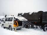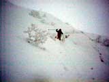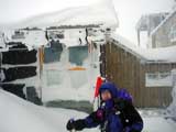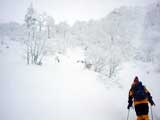 | あまり期待していなかった旭岳ですが、どうやらシーズンインしてくれたようです。 結果:もう、大丈夫 天候:雪 気温:-3〜-6度 積雪:温泉50〜60センチ、姿見の池駅周辺2メートル 雪質:良好 パウダー 本当は今回はあまり乗り気ではなかった。 先週の旭岳の状況が、かなり悲惨だったという話を聞いていたので、どうせ今週もだめだろうと思っていたのだ。旭川近郊のスキー場が一斉にオープンしてきたので、そちらにしようかなーとも思ったのだが、前夜突発的に、「全道のスキーヤーの皆さんのためにも、現在の旭岳の状況を調査するべきだ!」と思い立ち急遽出発を決めた(うそ。ホントはゲレンデに行くお金が無くて自棄になっていたんです)。 8時50分: 旭川出発。天候は曇天、気温+1度。 例によって遅い出発。途中セブンイレブンで朝食・昼食を仕入れる。昼食は直巻きおにぎりに限る。しかも赤飯(甘納豆入り)おにぎりに。 もちろん、ビールも仕入れる。 途中、天候が崩れて視界不良になってきたため、前日取り付けた新兵器「改良型黄色回転灯」を盛大に回しながら爆走する(道交法違反です。真似しないで下さい)。実に気持ちが良い。 途中、旭岳ビジターセンターで入山届けを済ませる。管理人に状況を尋ねたところ、「もう積雪は十分なのでスキーで上がれる」とのこと。ラッキー!それじゃあと雪崩ビーコンの貸し出し(妻の分)をお願いしたところ、姿見の池までなら必要ないと断られる。そうかなあ。まあ、いいや。 入山届けによると、旭岳には前日から北大の山スキー軍団(ワンダーフォーゲル、山岳部、フラテ等)と帯畜大が入っているようだ。しめしめ。これはラッセルが楽そうだ。 10時50分: 旭岳ロープウエイ駐車場出発。天候は雪、気温-3度、積雪量は50〜60センチ。 それにしても、ここは自衛隊の演習地か?何故か濃緑色のトラックとかジープとかが駐車場を威圧している(写真1)。そして、クロカンの練習に来た人の車・車・車。旭岳温泉周辺は大変にぎわっていた。そして、旭岳のスロープへ通じる道はあくまでも静まり返っていた(写真2)。 11時55分: 盤の沢直下で休憩。天候:小雪 無風。 ロープウエイ建設用に圧雪された道が続いており、登攀はとても楽だった。 このまま”てんにょがはら駅”を経由して圧雪斜面を登ってもおもしろくないので、盤の沢を登ることにする。もくろみ通り盤の沢へ向かって、ラッセルの跡が続いていたので利用させてもらった。これをラッセル泥棒と言う。 盤の沢はまだ完全には雪で埋まっていなくて、ブッシュが濃かった(写真3)。当然ルート取りも難しく、切り返しが多くて難儀した(枝に引っかかったり)。 標高1550メートルあたりから、視界が悪くなってくる。 先行者のトレースをショートカットしたところ、久しぶりに膝下までのラッセルを味合う。短距離なら楽しい。 盤の沢を登り切り、そろそろ”すがたみ駅”のマイクロウェーブアンテナとかが見えるはずなのだが、このあたりからホワイトアウトの様相を呈してくる(写真4)。旭岳初山行の妻が不安を訴えはじめたのでGPSなどを取り出して安心のデモンストレーションを行う。これくらいなら大丈夫だって。でもちょっぴり心配になって、赤テープを枝に付けながら進む。 13時40分: すがたみ駅到着(写真5)。 天候は雪 無風、気温-6度、積雪2メートル。視界不良 誰もいない”すがたみ駅”の玄関で休憩する(写真6)。この駅は昨年から来年の7月まで工事のため閉鎖されているのだ。今日は工事関係者も居なかった。 まずはビールで乾杯!うまい(写真7)。展望はまったく望めなかったが、汚れの無い雪に囲まれている事が何よりもうれしい。しばし風音ひとつしない静寂を楽しむ。 時間が遅いので、昼食後早めに滑降の準備を行い2時頃に出発した。 期待していた盤の沢の滑降は難しかった。雪質は良好なのだが、やはり積雪量が足りないのだ(写真8)。 一見良さそうな斜面も、突っ込むとスキー板の裏に時々木の枝の感触やハイマツの感触が当たる。恐くて飛ばせない。ブッシュも多く、小さな沢も埋まっていないのでコース取りが難しい。 これは、大変だなと思い妻を振り返ると、、、あれ?どこだ? 登り返して探しに行くと、やっと現れた。 妻は立木に突っ込んだり、スキーが雪に刺さったり、コースアウトしてラッセルしたりしていたようだ。あまり多くを語らないが、相当やられたらしい。 コースの下部の狭い急坂付近では、ボーダーがコースの幅を半分塞ぐ形で2カ所ほどジャンプ台を作っていた。妻が彼等を避けようとして転んでしまう。コース上にはジャンプ台を作るべきじゃないし、せめて遊んだ後はジャンプ台を壊しておいて欲しい。テレマーカーは狭い急坂に弱いのだ。 結局、旭岳ロープウエイ駅駐車場に到着したのが15時30分。駐車場には我々の車しか残っていなかった。さびしい。温泉に浸かったあと旭岳温泉を後にした。 旭川へ帰る途中で、東川町にあるテレマークスキーの師匠の渋谷さんの喫茶店