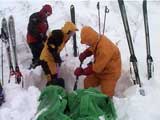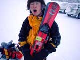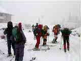 | 待望の今シーズン初の三段山。しかし! 結果:撤退 天候:吹雪 気温:-15〜-25度 積雪:少な目だが十分滑降可能 雪質:パウダーだが、深い コース:三段山白銀荘コース(夏道コース) 8:30 旭川出発 気温-7度 天候雪時々曇り 昨夜から滝川の、なをたか君が来て我が家に投宿していたためか、めずらしく予定通り出発(写真1)。出発時はたまたま日が射していたため浮かれる。 途中S君とも合流。本日の三段山アタックは総勢4名となった。 その後天候が悪化して吹雪となる。もちろん回転灯は全開である。 上富良野町から白銀荘にかけては通常2車線の道路が除雪が追いつかなくて1車線になってしまっていた。スタックしそうになりながらなんとか白銀荘にたどり着く。 9:40 白銀荘到着 気温-15度 天候吹雪 白銀荘前は驚いたことに大変な人出。前日から白銀荘に投宿していた人が多かったようだが、この天候にしてこの人出。うーん。みんな熱心ですねー。(写真2)。 ファンスキーにリーバ2をつけたものをS君が持ち込んでくれたのだが、今回は雪が深いため使用できず残念(写真3)。 入山届けを行うために白銀荘へ入ったところ、友人Kと出会う。本当は今日は前十勝へ登る予定だったのだが、悪天候のため中止して三段山の麓で遊ぶとのこと。そうだろうなあ。「もちろん旦那は頂上までいくだろ?」とか言われる。おまえが行け! 丁度ツアーを主催していた大橋先生と久しぶりに出会い挨拶する。 10:05 白銀荘出発 積雪は熊笹の頭が少し見えている程度で、この時期にしては積もっている方だと思う。もちろん滑降には十分な積雪である(写真4)。雪はパウダーだが一気に積もったため深くて重い。 幸い森林限界まではトレースがはっきりしていて、ラッセルをさぼることができた。しかし、例によって旦那の貼り付けシールがはがれる。なぜ?(泣)メンテナンスやり直しだー。頼みの予備シール(秀岳荘オリジナル)はシールを忘れてきた、なをたか君に貸してしまっているし。やむ終えず、S君の両面テープで部分的にシールを留め、その上からガムテープで補強してしのぐ。 この頃の天候は一時的に風と雪がやんで落ち着いていた(写真5)。途中で雪だるまになって降りてきた二人連れとすれ違ったので状況を尋ねると、1500メートル付近でデポ旗が足りなくなって降りてきたとのこと。 夏道コースを通り森林限界で休憩していると、下山中の旭川山岳会と山工房主催のツアー一行と出会い50メートルほど離れたところから大声で世間話をする(苦笑)。山頂まで行ったのか?と尋ねると、「行ったよ!今日みたな天気には登らないと!」と言われる。うーん。さすがである。(後日、これが大嘘であることが判明!やられた!) 標高1300メートル付近の尾根に上がったとたんに天候の模様が一変する(いつものことだが)。降雪は大したことはないのだが、強風と視界不良のため、赤テープとデポ旗をベタ打ちにして登り続ける(写真6)。 この付近は、まだハイマツが少し顔を出していた。ハイマツを避けるようにナマコ尾根側の沢ぎりぎりのコース取りで登る。ここは雪庇が発達しているので注意が必要だ。このあたりから、ラッセルと発達した吹き溜まり越えに苦しめられる。 12:30 標高1580メートル付近 山頂まであと30分程度の地点でデポ旗が足りなくなることがはっきりし、雪面の状態も悪いために登頂を断念した。この時点で気温は-25度!久しぶりの極低温である。手足の先つま先が痛い。特に革靴のなをたか君はつらそうだ。ゲーターを装着していても保温はプラ靴に劣る。 同時に旦那自慢の各種電子機器が次々に作動不良になっていった。 まず、IC Recorderが作動しなくなった。これは、アルカリ電池を使用していたためと思われる。 次に外気にさらしていたDVカメラが作動しなくなった。ファインダーを覗くとインフォリチウムバッテリーは100分以上録画できると表示されているのだが、録画ボタンを押すと電池切れのメッセージとともに電源が落ちる。これは初めての現象だ。ちなみにファインダーは暗く、反応速度が極端に遅くなっていて画像はブレブレ。 良い機会なので、ほかの電子機器もテストした。 超安物(2万円のFUJI FILM DS-10S)のデジカメは、安物故の構造の単純さが功を奏したのか、なんとか作動し撮影できた。 GPSもかろうじて作動したが、液晶表示の能力がダメージを喰らって数字の判別がとても困難だった。これは今回はGPSを胸ポケットに入れて保温していなかったためと思われる。 今回初登場のなをたか君自慢の一品。デジタルアバランチビーコンM1は残念ながらテストし忘れた。おそらく体に密着させているので大丈夫だったと思うが。 (これらの機器は下山後どれも正常に作動した。心配された液晶などへのダメージは残らなかった。) この地点で、なぜか嬉々としてツエルトを張って宴会をする(普通はこの状況下ではとりあえず樹林帯まで降りるものだが)(写真7)。昨年三段山で同じような吹雪に襲われて半泣きだった妻が今シーズンはケロッ