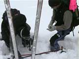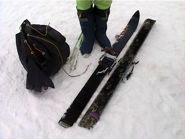 彼はゾンメルスキー乗りだ。ゾンメルスキーとは巾広のスキー板の裏一面にシールが接着してあるもので、彼はそれに普通の長靴!を履いて使っている。ちなみに絞め具は革のベルトだ(写真1)。