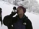 そこからラッセルの先頭を交代して進み、2段目でひと休み。ここでなにを思ったか旦那がワインを飲み出す(写真4)。登坂中の飲酒は心臓に負担をかけるので厳禁である!おそらく後でバチが当たるだろう。