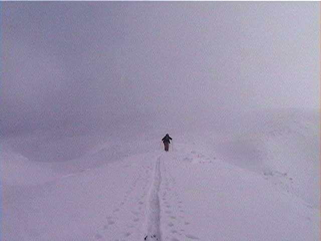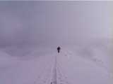 2段目の上で、他のルートをたどって来た登山者が下山を開始していた。視界があまりよくないからだろう。しかし、デポ旗を打つほどではない。雪質は最高だ。と、ここで突然ゾンメルスキーのE山さんが走り出す!さすがに ゾンメルスキーの登坂性は高いなぁ。いや!それ以上にE山さんの体力がすごい。彼は大学在学中に天文クラブの夏季合宿で毎週札幌から富良野まで自転車!で通っていたというが、そのエピソードもうなずける。それにしても三段山を走って登る人は初めて見た。