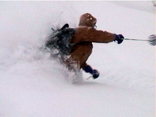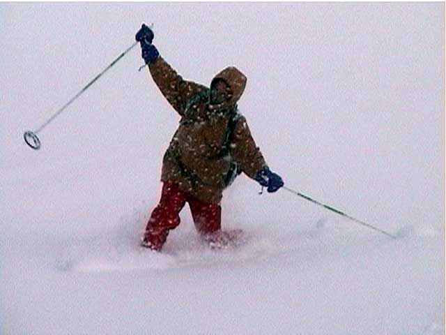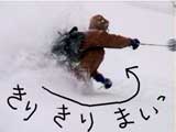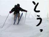 それに比べて他の三段山クラブ員の楽しそうな事。山スキーヤーのG君は相変わらず見事な暴走ぶりだし(写真7)。ゾンメルスキー+長靴のE山さんは、ヤジロベエのように絶妙なバランスを取りながら滑降し(写真8)、時々回転のかかった凄い転び方をする(写真9)。はやり滑降に難がありそうだが、極めると万能な板なだけにおもしろそうだ。