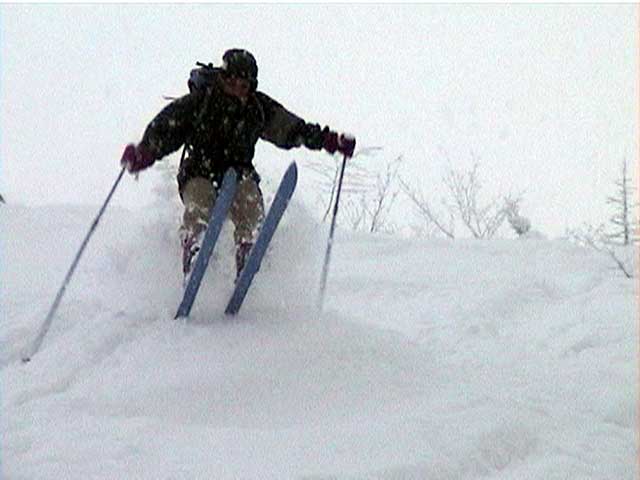 三段目の上部まで下ったところで、ベテランのオーラを放つ単独行の山スキーヤーが登ってきた。何か強く惹かれるものを感じて挨拶しに行くと、「旦那さんですかー?」「?」「H川です。白銀荘に回転灯のついた車があったので・・・」「!」北海道のクロカン事情紹介のページで有名な山スキーヤーのH川さんである。メールは何度かやりとりしていたが、今回が初対面であった。