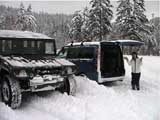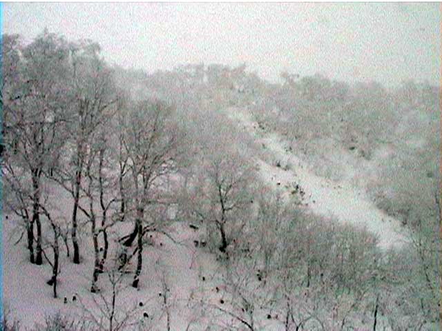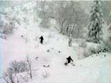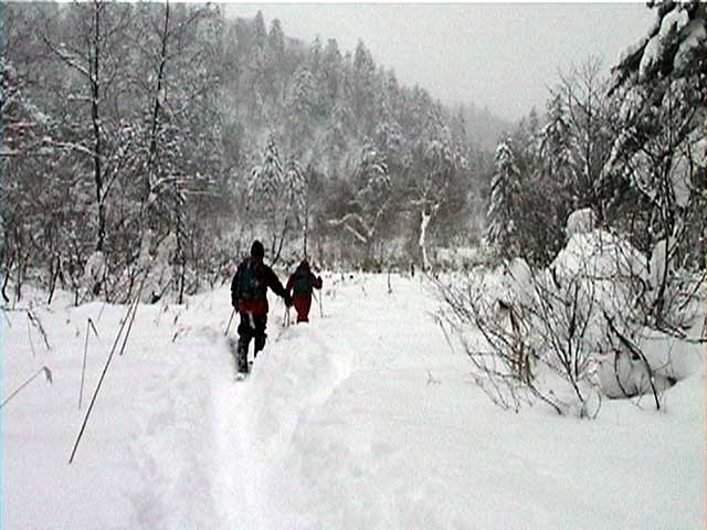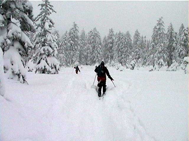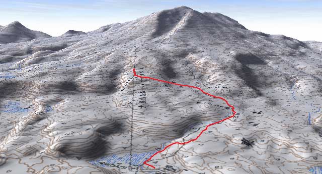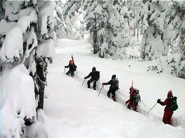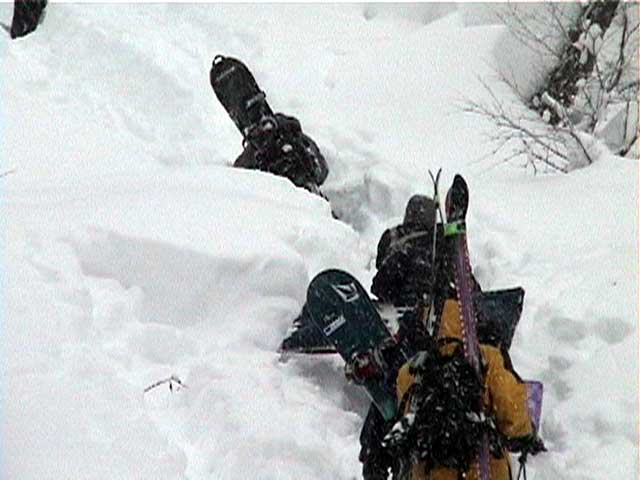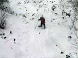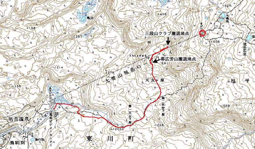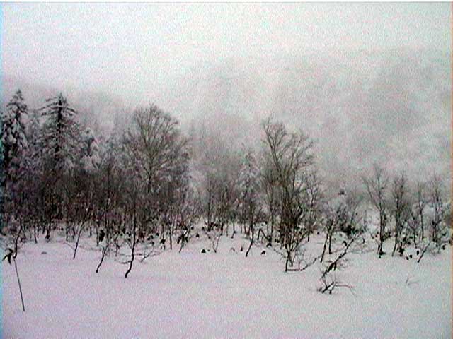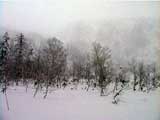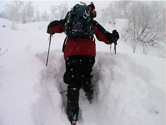 結果:姿見の池駅手前で力尽きた 天候:雪 風速:無風〜2メートル 気温:-3〜-12度 雪量:不足気味だが、山スキーには十分 雪質:良 パウダー 実は、当初黒岳へ向かうはずだったのだが、極度の財政難のため、ロープウエイ代をケチって旭岳に変更となった。 前日に旭岳ビジターセンター(TEL 0166-97-2153)へ問い合わせたところ、 「旭岳温泉ロープウエイ駅周辺で積雪1メートル以下。姿見駅周辺で50〜60センチ。 スノーシューで登山する場合は、膝下程度までラッセルを覚悟してほしい。 山スキーでは、登攀時は問題ないが滑降時には、ブッシュが濃くてまだ難しい。」 とのことだったが・・・ 8:30 旭川市 天候:雪 無風 -3度 前日から降り続い、車はすっかり覆われていた。このぶんだと、かなりの積雪が期待できる。前日に取り付けた回転灯が凛々しい(写真1)。 実は8時に家を出たのだが、ストックを忘れた馬鹿(オレ)の為に一度家へ戻ったので、こんな出発時間になってしまった。夕べ布団の中でストックにガムテープを巻き付ける作業をしていて、そのまま布団の中にストックを入れたまま寝てしまっていたのだ(^_^;)。シーズン始めは勘が鈍りトラブルが多発する。 9:30-10:00 旭岳ロープウエイ駅 駐車場 天候:雪 無風 -10度 旭岳ビジターセンターで入山届けを記入。 管理人によると昨日から今日にかけて40〜50センチの積雪があったとのこと。 センター内外には、たくさんのクロスカントリースキーヤーが居た。 ロープウエイ駅の駐車場は、自衛隊の車だらけ(クロカン選手用。さては冬戦教か?)で、一般車両は3〜4台しかいない。除雪されていないので、積雪30センチくらいの雪を押しのけて駐車する(写真2)。 さて、登り口の様子はこんな感じ(写真3)。ブッシュが多いとはいえ、恐らく1.5メートル程度の予想以上の積雪量だ。 しばらく登ると、スノーボーダーの一団が苦戦している現場に遭遇した(写真4)。スノーシュウも履かずに、ツボ足でもがいている。うーん、健闘を祈る。 標高1200メートル付近まで上がると、ブッシュが隠れて快適な雪原が広がっていた。それにしても、この真新しいトレースは誰が付けてくれているのだろうか? 11:15 盤ノ沢分岐付近 天候:雪 無風 気温:-12度 ありがたいトレースの作り主達、帯広労山の方々と合流した(写真6)。太股近くの深さのラッセルを延々こなしてくれていた大恩人集団である。 労山の方から「どちらの会ですか?」と聞かれたので、「三段山クラブですっ!」とハキハキ答えたが、怪訝そうな顔をされてしまった(そりゃそうだ)。進退窮まった私に、「三段山クラブHPの旦那さんですね?」と優しい助け船を出してくれたのは、帯広労山HPのウエブマスターS 氏であった。はじめまして。 盤ノ沢の様子はこんな感じ(写真7)。この中のどこかで北大が幕営しているはずなのだが、見あたらない。 ブッシュが濃いことと、ラッセルが大変そうなことから、ここから天女ケ原駅(跡地)経由で姿見の駅を目指すことにする。 ここからはラッセルを交代しながら助け合って進むのだが(写真8)、軟弱クラブ三段山はラッセルに滅法弱い(あっ!キさんは頑張っていましたよ)。このあたりの状況は、日常ゆきこ¥日常アウトドア(ラッセル天国) を見ていただこう。 12:11 天女ケ原駅(跡地) 天女ケ原駅(跡地)手前で、帯広労山の方たちが引き返し、トレースを辿ったおかげで体力を温存していた我々はそのまま登攀を続行した。 しかし、どうもルートがはっきりしない。GPSで現在位置は確認できるのだが、スキーコースがマップに記載されていないので、本来のコースがわからないのだ。 いつもは盤ノ沢コースを通っているので、なおさら土地勘が働かない。そうこうしているうちに、腰高以上にまで雪が深くなり、三段山クラブにとっては、あまりにも辛い試練であるラッセル祭りと化してきた。 13:00 標高1450メートル付近 |