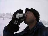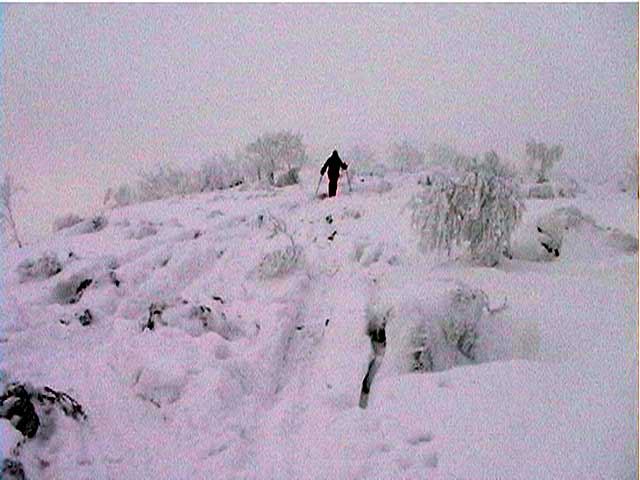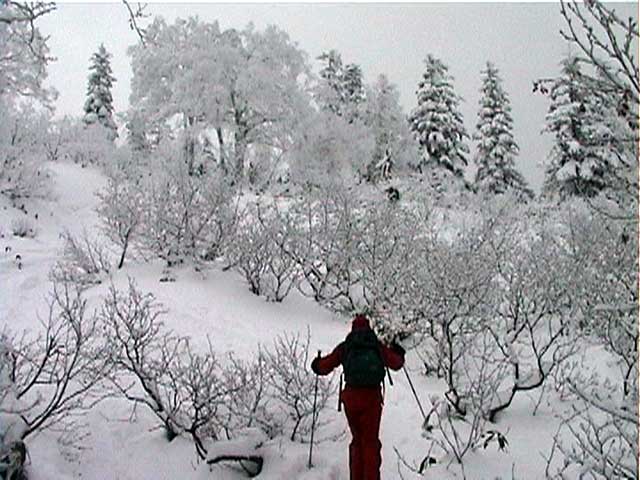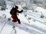 結果:ハイマツに触雷。二段目の上で撤退 天候:雪 風速:ほぼ無風(尾根上は強風だったらしい) 気温:0〜-10度 雪量:不足 雪質:良 パウダー 前日に、白銀荘へ確認したところ、 11月24日現在、積雪50センチで笹が見えている状況。その上にはハイマツが顔をだしている状況。 しかし、山スキーで入った人も居るとのこと。 まあ、山スキーで入山は可能だが、滑降は無理ってな感じでしょうか。三段山クラブの過去の山行記録でも、この時期には大抵敗退しています。まあ、ダメもとで様子を見てきましょうか。 10:30 旭川市 天候:くもり 無風 0度 なんとも、やる気のない時間に出発。 今回の山行に対する気合いの入り方がわかる。 11:45 白銀荘 天候:雪 無風 -10度 ツルツル路面に苦労しながら到着してみると、お!思ったよりも雪がある(写真1)。除雪をしていた白銀荘の方の話では積雪60センチだということだが、この笹の隠れ方では1メートル近くの積雪があるのではないだろうか? だらだら支度を始めたところで、同じ色のホンダ車に乗ったナイスガイから、「三段山クラブの人ですか?」と言われて驚いた。 黄色回転灯で分かったらしい。やっぱり回転灯は目立つなあ。効果抜群だ!(なんの?)同じ旭川人同士、今後ともよろしくお願いします。 彼の話だと、今日はすでに10人!くらい上へ上がっているらしい。雪もないのに、奇特な人達もいるものだ(先を越されて嫉妬している)。 12:00 白銀荘出発 登り始めると、やはり笹が目に付く(写真2)。 一段目が見えてきた(写真3)、やはりブッシュが濃いが、ここまでは特に登高に苦労することは無かった。 一段目に取り付いてみると(写真4)、案外楽しめそうな斜面に仕上がっていた。笹は見かけほど滑降の邪魔にはならないのだ。 登り返して楽しんだ形跡もある。雪も軽いので楽しそうだ。12:30に一段目通過。 12:48 二段目 天候:雪 無風 気温:-10度 ここで、三段目から降りてきたという、10名ほどのテレマーク部隊と遭遇(写真5(上の方にちらりと見える))。この時期に?この人数?そして全員テレマーク???素晴らしい一団だ!と、思ったらここでも「三段山クラブの人ですか?」 そういえば、その方とは以前山で出会ったことがある。sandan yama 2000も見てくれたとのこと。とても素晴らしい一団だ! 昨日彼の仲間の結婚式があって、その参加者が今日三段山へ入っているのだと言う。 うらやましい結婚式だ。負けた。私の結婚式でも翌日には三段山で宴会をしたが、さすがに夏だったのでスキーは出来なかった。くそぅ完敗だ。で、結婚した本人達は?え?モルジブ? 三段山へ来れば良いのに・・・(^_^;) およばずながら、私も勝手に祝杯をあげさせてもらった(写真6)。同じ三段山愛好者として、乾杯!(登りの途中でビール・・・) ウエディング・テレマーク軍団のすぐ後に、ベテラン風の山スキーヤーが二名降りてきた。 途中で、すごいスピードで追い上げてきたスノーシュウ+ボード軍団4人組と一緒になった。どうみてもただ者ではない。と、思ったら、「三段山クラブの人ですか?」と問われた(こればっかし)。HPを見てくれている方がいて、デポ旗で分かったという。やっぱりデポ旗は目立つなあ。効果抜群だ! |