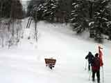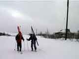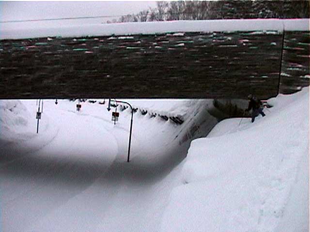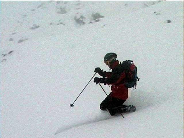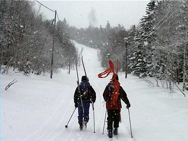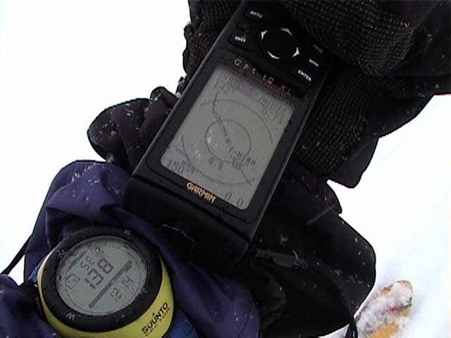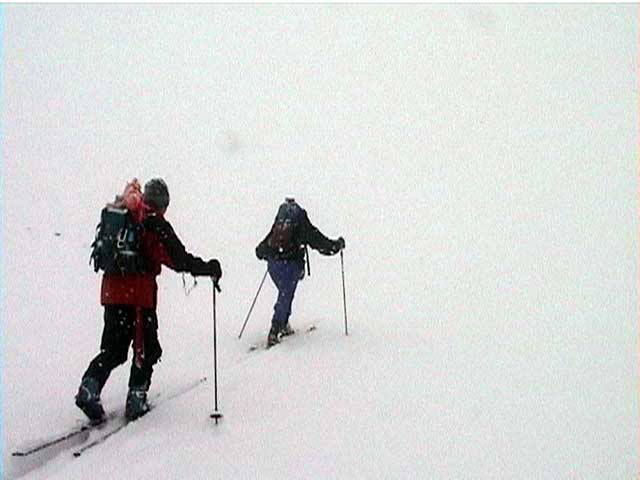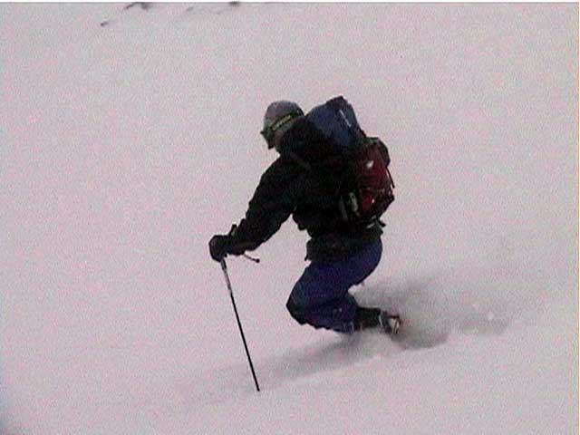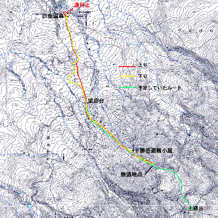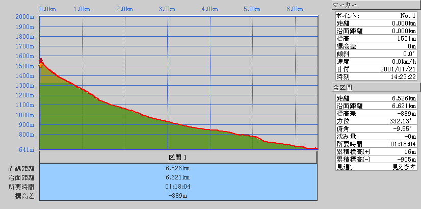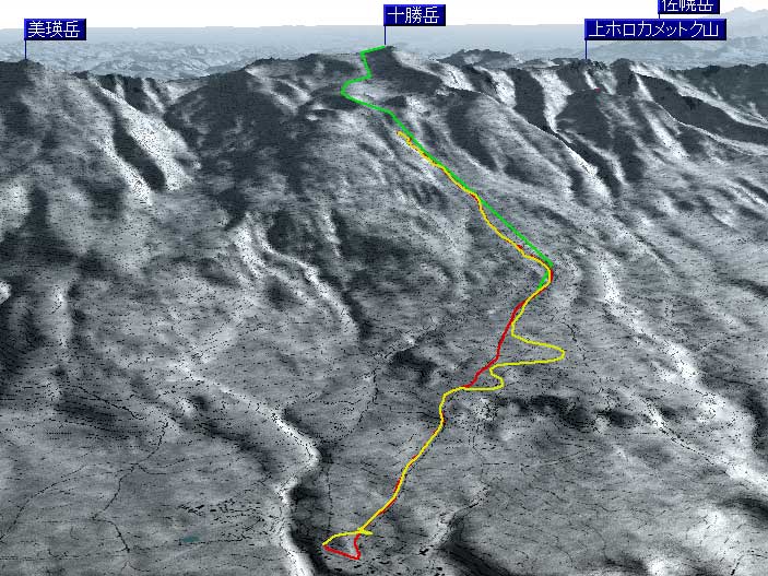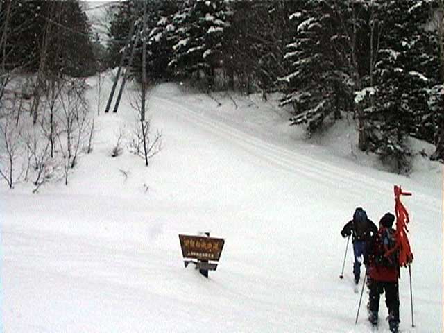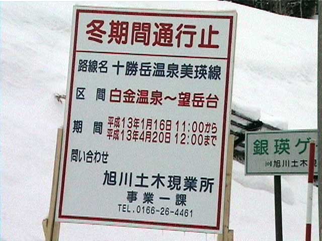 | 結果:標高1531M地点で撤退 天候:雪、視界悪し 風速:0〜3メートル 気温:-5〜-15度 雪量:避難小屋から上は十分。避難小屋〜望岳台間は地雷(岩)注意 雪質:15センチ程度の浅パウダー コース:白金温泉〜望岳台〜十勝岳 今回は天候が悪そうだったので、デポ旗てんこ盛り。漁師テレマーカー達から、白銀荘〜十勝避難小屋間は岩が出ていてやばいと聞いていたので、望岳台から登ることにした。 実はチトカニウシと迷った末の十勝岳山行だったが、吉とでるか凶ととでるか・・凶とでました。 9時40分 白金温泉 天候:曇り 無風 望岳台へ10時集合の予定だったが、なんと白金温泉から上は通行止め(写真1)。昨年までは通年開通だった筈。まったく初耳で驚いた。 銀瑛ゲート横の看板(写真2)にはこう書いてある。 冬期間通行止め 十勝岳温泉美瑛線 区間 白金温泉から望岳台 期間 平成13年1月16日から4月20日まで 問い合わせ 旭川土木現業所 事業一課 0166-26-4461 困ったものだ。利用者が少ないということだと思うが、登山者はもちろん十勝岳を間近に見たい観光客も多いだろうに。いやいや、とりあえず私たちはこれからどうしたらよいのだ?仕方ない、歩こう。 この時点で十勝岳登頂の見込みは吹き飛んだ。わはは。 10時10分 望岳台遊歩道 ゲートをくぐって車道を詰めることも考えたが、ゲートから少し下ったところにある望岳台遊歩道を登ることにした(写真3)。以前は十勝岳スキー場からの林間コースだったところなので、快適な滑降ができるかもしれないと思い、その下見のためである。 で?このコースはどうだったかというと、ひたすらだるいコースであった(写真4)。滑降も楽しめそうにない。 コースは何故か良く整備されていて歩きやすかった。たまたまかもしれないが・・ かなり雪面が堅かったので、スーさんはスキー板を担いで登る。 11時20-33分 望岳台 天候:小雪、風速1〜2m、-4度 おおよそ4キロ近くの道のりを歩いてやっと望岳台へ到着(写真5)。あー疲れた。歩くスキー大会じゃないんだから・・・これで、予定より一時間以上もロスしてしまったことになる。 小休止して行動食をほおばりながらあたりを見渡すと、レストハウスが閉鎖されていて、あたりはひっそりと静まりかえっていた。しかし、ここへ至る道は結構綺麗に除雪されているのが不思議だ。なんで? ここからは視界が急速に悪化してきた(写真6)。 それと・・・岩が潜んでいる。薄い雪に多くの岩が隠れていてとても危険だ。 元スキー場のコース上を通れば、安全だと思ったのが間違いだった。帰りが思いやられる。 12時46分-13時45分 十勝岳避難小屋 天候:雪、風速1m、-10度 「方位143度482メートル先へ!」(写真7)なーんてやりながら避難小屋に到着(写真8)。ホワイトアウトの中でGPSとコンパスを頼りに避難小屋を探すのは、結構おもしろかった。 50メートルくらいまで近寄らないと避難小屋は視認できなかったので、GPSが無かったらたどりつけなかったかもしれない。 小屋の中でスーさんからカップラーメンを頂き楽しい昼食。ごちそうさまでした。すでに登頂はあきらめているので、のんびりと固形燃料で暖を取ってから再出発(写真9)。 14時28分 1531メートル地点 天候:雪、風速2m、-15度 デポ旗を打ちながら急斜面を詰めたが、視界はさらに悪化。少し平坦な場所を見つけてここからの撤退を決定する。これ以上遅くなると時間的にもまずい(じゃあ、もっと早く動けって・・)。 雪質は良好。堅目のバーンの上にパウダーが15センチ程度乗っている。 結構な急斜面を滑降する面々(写真10〜12)。視界以外はとても好条件な滑降であった。しかし避難小屋の手前で私は巧妙にカモフラージュされた岩に触雷!転倒。 さらに、避難小屋から下は(泥流スロープと呼ばれているらしい)地雷だらけ。 怖くてスピードが出せない。いや、どんなに慎重に滑降しても触雷する。 十勝岳行きを決めた責任もあるので、私はなるべく先頭を滑って掃海艇の役目を担うことにした。 岩にぶつかるたびに悲鳴を上げて警告する。「ガリッ!(岩がソールを削る音)あーん、岩〜!」「ガリリリッ!うううう、また岩だ〜!」ってな感じ。 15時07分 望岳台 天候:雪 無風 -10度 やっと地雷原を突破して望岳台へ着いた時には、私の精神も買ったばかりのスキーもズタボロ。板は芯材まで穴が空いてしまった。 15時37分 白金温泉 天候:くもり 無風 -10度 望岳台からは、しばらく閉鎖された車道を下ってみた(写真13)。が、あまりにも傾斜が足りなくて滑らないため途中から望岳台遊歩道へ(写真14)。 ゆるーい遊歩道で滑りは楽しめなかったが、車道より少しましだった。 最後にゲート付近で無理矢理車道へ降りて、おしまい(写真15)。 すでに周囲は少し薄暗くなっていた。お疲れさまでしたー。 ゲートの向かいにある白樺荘は日帰り入浴が300円と安い(そのかわり、シャンプーはおろか石鹸すら無い)。ちなみに白樺荘で通行止めの事を聞いたら、主人も知らなかった(オイオイ・・目と鼻の先の事だぞ)。 近くに露天風呂の